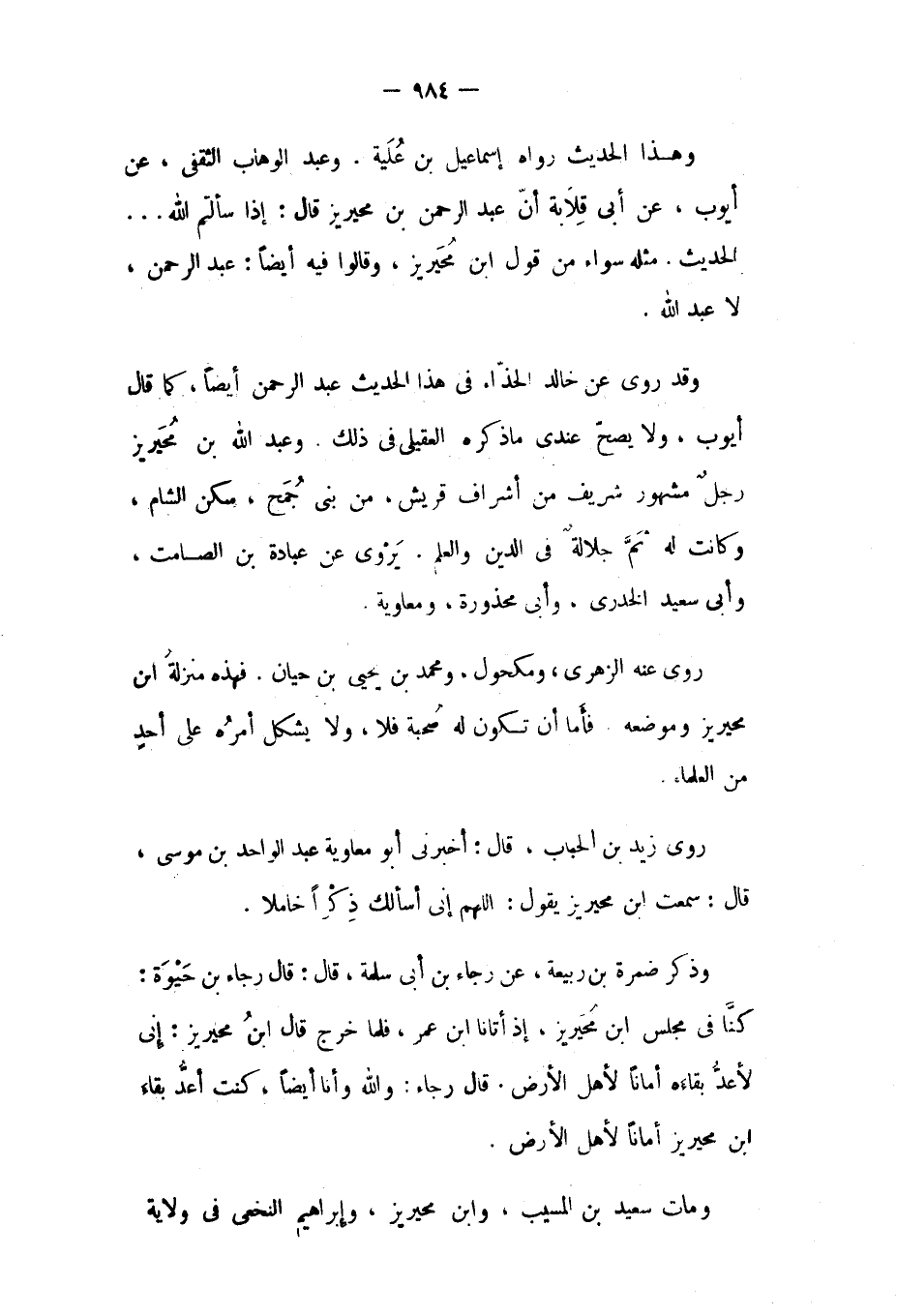 وقد رَوَى عَنْ خَالِد الحذاء فِي هَذَا الحديث عَبْد الرَّحْمَنِ أيضا، كما قَالَ أَيُّوب، ولا يصح عندي مَا ذكره العقيلي فِي ذَلِكَ. وعبد الله بْن محيريز رجل مشهور شريف من أشراف قريش، من بني جمح، سكن الشام، وكانت لَهُ ثُمَّ جلالة فِي الدين والعلم. يروي عَنْ عبادة بْن الصامت، وَأَبِي سَعِيد الْخُدْرِيّ، وَأَبِي محذورة، ومعاوية.