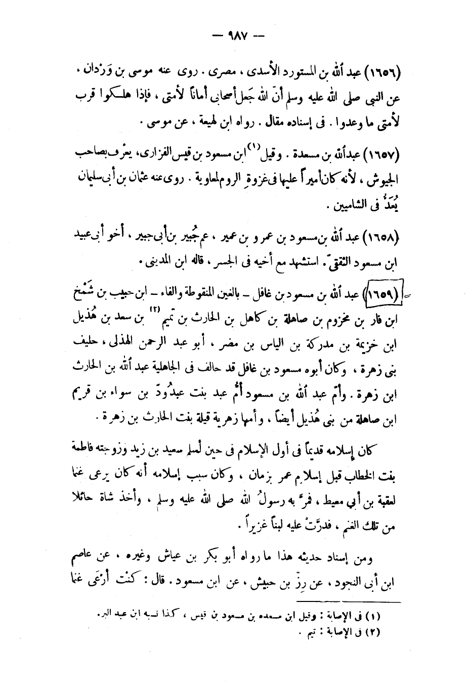 (١٦٥٩) عبد الله بْن مَسْعُود بْن غافل- بالغين المنقوطة والفاء- ابْن حَبِيب بن شمخ ابن فار بْن مخزوم بْن صاهلة بْن كاهل بن الحارث بن تميم [٢] بن سعد بن هذيل ابن خزيمة بن مدركة بن إلياس بن مضر،
