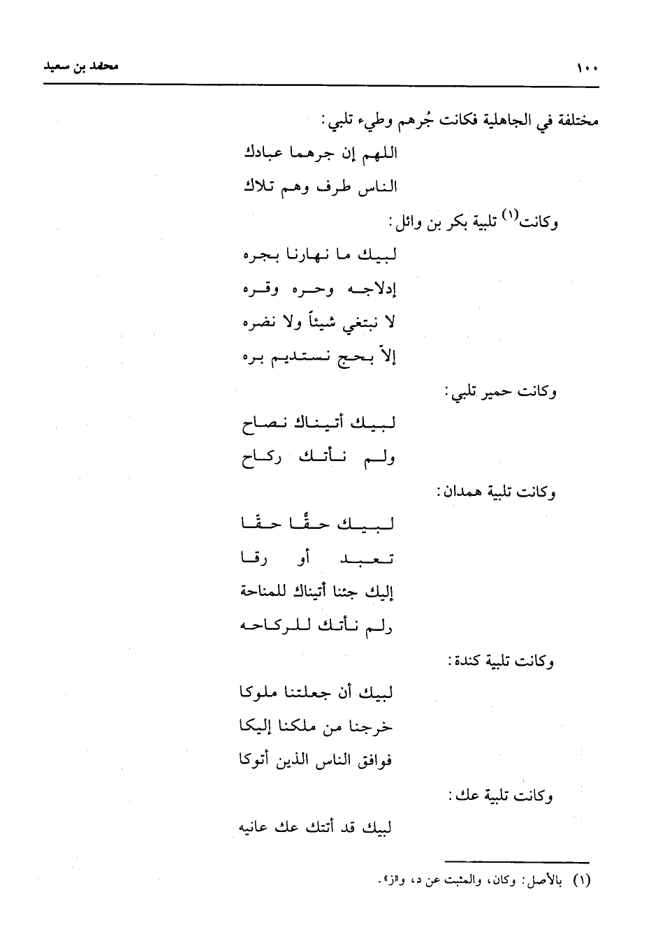 مختلفة في الجاهلية فكانت جرهم وطئ تلبي * اللهم إن جرهما عبادك * الناس طرف وهم تلاك وكانت (1) تلبية بكر بن وائل * لبيك ما نهارنا بجره * إدلاجه وحره وقره * لا نبتغي شيئا ولا نضره * إلا بحج نستديم بره وكانت حمير تلبي * لبيك أتيناك نصاح * ولم نأتك ركاح وكانت تلبية همدان * لبيك حقا حقا * تعبد أو رقا * إليك جئنا أتيناك للمناحة * ولم نأتك للركاحه وكانت تلبية كندة * لبيك أن جعلتنا ملوكا * خرجنا من ملكنا إليكا * فوافق الناس الذين أتوكا وكانت تلبية عك * لبيك قد أتتك عك عانيه *