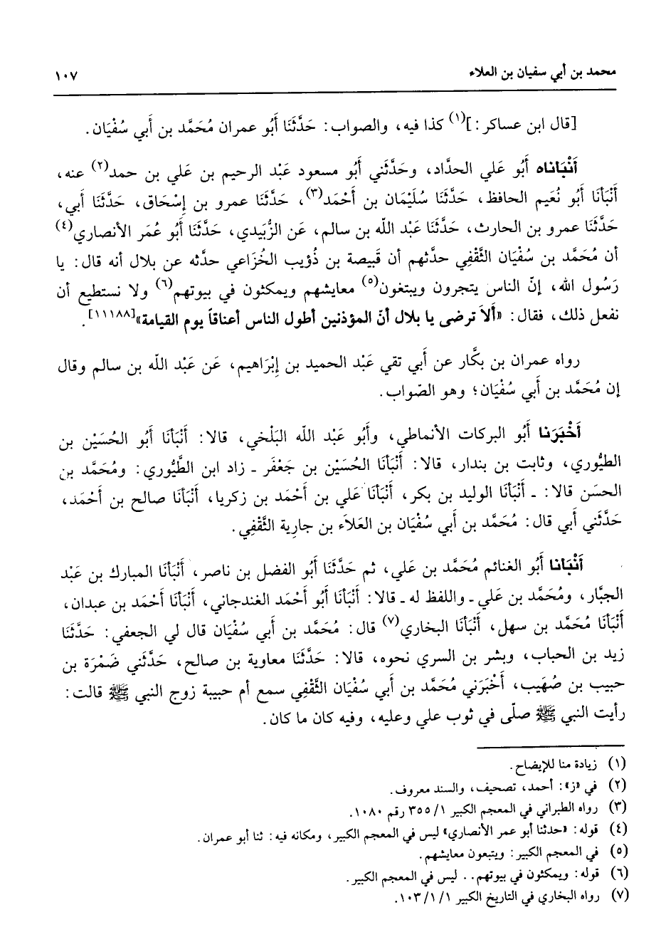 قال ابن عساكر (1) كذا فيه والصواب حدثنا أبو عمران محمد بن أبي سفيان أنبأناه أبو علي الحداد وحدثني أبو مسعود عبد الرحيم بن علي بن حمد (2) عنه أنبأنا أبو نعيم الحافظ حدثنا سليمان أحمد بن أحمد (3) حدثنا عمرو بن إسحاق حدثنا أبي حدثنا عمرو بن الحارث حدثنا عبد الله بن سالم عن الزبيدي حدثنا أبو عمر الأنصاري (4) أن محمد بن سفيان الثقفي حدثهم أن قبيصة بن ذؤيب الخزاعي حدثه عن بلال أنه قال يا رسول الله إن الناس يتجرون ويبتغون (5) معايشهم ويمكثون في بيوتهم (6) ولا نستطيع أن نفعل ذلك فقال ألا ترضى يا بلال أن المؤذنين أطول الناس أعناقا يوم القيامة