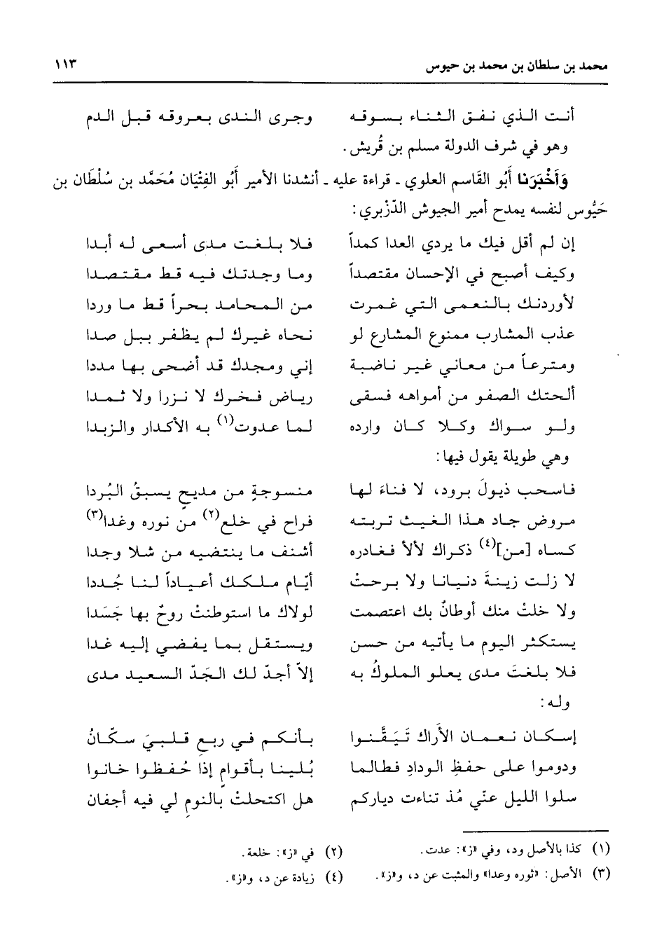 (أنت الذي نفق الثناء بسوقه * وجرى الندى بعروقه قبل الدم * وهو في شرف الدولة مسلم بن قريش وأخبرنا أبو القاسم العلوي قراءة عليه أنشدنا الأمير أبو الفتيان محمد بن سلطان بن حيوس لنفسه يمدح أمير الجيوش الدزبري * إن لم أقل فيك ما يردي العدا كمدا * فلا بلغت مدى أسعى له أبدا وكيف أصبح في الإحسان مقتصدا * وما وجدتك فيه قط مقتصدا لأوردنك بالنعمى التي غمرت * من المحامد بحرا قط ما وردا عذب المشارب ممنوع المشارع لو * نحاه غيرك لم يظفر ببل صدا ومترعا من معاني غير ناضبة * إني ومجدك قد أضحى بها مددا ألحتك الصفو من أمواهه فسقى * رياض فخرك لا نزرا ولا ثمدا ولو سواك وكلا كان وارده * لما عدوت (1) به الأكدار والزبدا * وهي طويلة يقول فيها * فاسحب ذيول برود لا فناء لها * منسوجة من مديح يسبق البردا مروض جاد هذا الغيث تربته * فراح في خلع (2) من نوره وغدا (3) كساه من (4) ذكراك لألأ فغادره * أشنف ما ينتضيه من شلا وجدا لا زلت زينة دنيانا ولا برحت * أيام ملكك أعيادا لنا جددا ولا خلت منك أوطان بل اعتصمت * لولاك ما استوطنت روح بها جسدا يستكثر اليوم ما يأتيه من حسن * ويستقل بما يفضي إليه غدا فلا بلغت مدى يعلو الملوك به * إلا أجد لك الجد السعيد مدى * وله * إسكان نعمان الأراك تيقنوا * بأنكم في ربع قلبي سكان ودموا على حفظ الوداد فطالما * بلينا بأقوام إذا حفظوا خانوا سلوا الليل عني مذ تناءت دياركم * هل اكتحلت بالنوم لي فيه أجفان