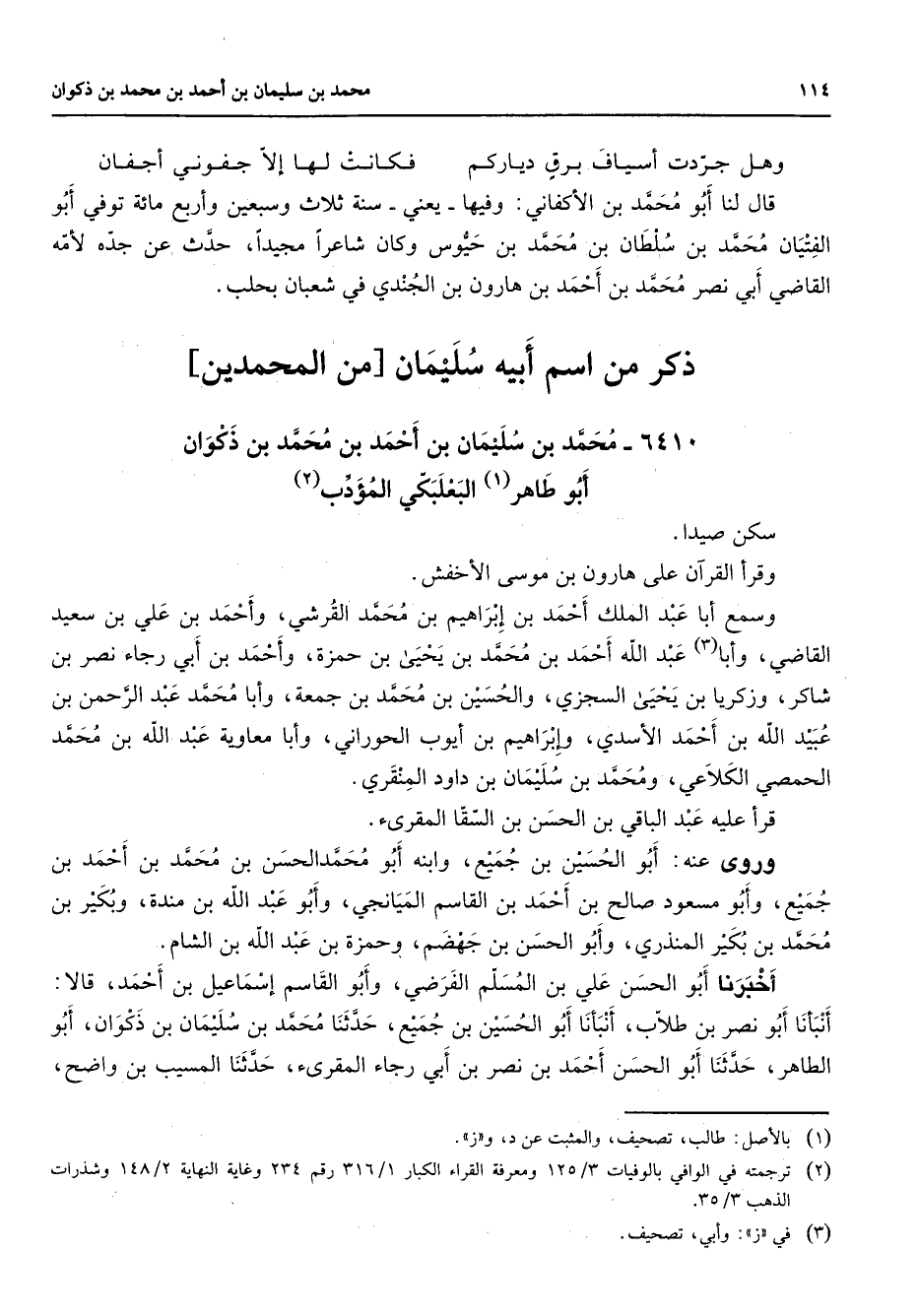6410 - محمد بن سليمان بن أحمد بن محمد بن ذكوان أبو طاهر (1) البعلبكي المؤدب (2) سكن صيدا وقرأ القرآن على هارون بن موسى الأخفش وسمع أبا عبد الملك أحمد بن إبراهيم بن محمد القرشي وأحمد بن علي بن سعيد القاضي وأبا (3) عبد الله أحمد بن محمد بن يحيى بن حمزة وأحمد بن أبي رجاء نصر بن شاكر وزكريا بن يحيى السجزي والحسين بن محمد بن جمعة وأبا محمد عبد الرحمن بن عبيد الله بن أحمد الأسدي وإبراهيم بن أيوب الحوراني وأبا معاوية عبد الله بن محمد الحمصي الكلاعي ومحمد بن سليمان بن داود المنقري قرأ عليه عبد الباقي بن الحسن بن السقا المقرئ وروى عنه أبو الحسين بن جميع وابنه أبو محمد الحسن بن محمد بن أحمد بن جميع وأبو مسعود صالح بن أحمد بن القاسم الميانجي وأبو عبد الله بن مندة وبكير بن محمد بن بكير المنذري وأبو الحسن بن جهضم وحمزة بن عبد الله بن الشام أخبرنا أبو الحسن علي بن المسلم الفرضي وأبو القاسم إسماعيل بن أحمد قالا أنبأنا أبو نصر بن طلاب أنبأنا أبو الحسين بن جميع حدثنا محمد بن سليمان بن ذكوان أبو الطاهر حدثنا أبو الحسن أحمد بن نصر بن أبي رجاء المقرئ حدثنا المسيب بن واضح