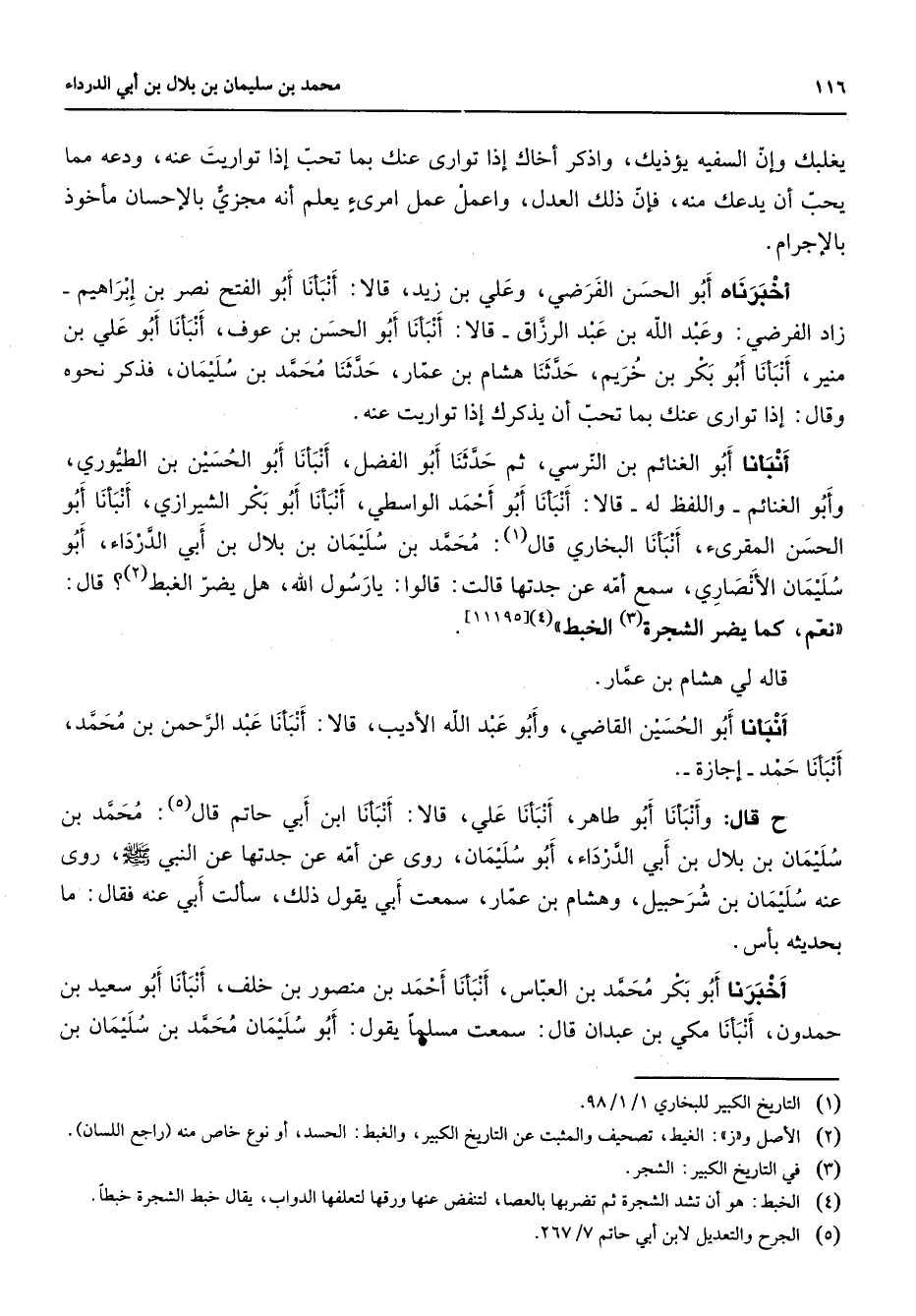 يغلبك وإن السفيه يؤذيك واذكر أخاك إذا توارى عنك بما تحب إذا تواريت عنه ودعه مما يحب أن يدعك منه فإن ذلك العدل واعمل عمل امرئ يعلم أنه مجزي بالإحسان مأخوذ بالإجرام أخبرناه أبو الحسن الفرضي وعلي بن زيد قالا أنبأنا أبو الفتح نصر بن إبراهيم زاد الفرضي وعبد الله بن عبد الرزاق قالا أنبأنا أبو الحسن بن عوف أنبأنا أبو علي بن منير أنبأنا أبو بكر بن خريم حدثنا هشام بن عمار حدثنا محمد بن سليمان فذكر نحوه وقال إذا توارى عنك بما تحب أن يذكرك إذا تواريت عنه أنبأنا أبو الغنائم بن النرسي ثم حدثنا أبو الفضل أنبأنا أبو الحسين بن الطيوري وأبو الغنائم واللفظ له قالا أنبأنا أبو أحمد الواسطي أنبأنا أبو بكر الشيرازي أنبأنا أبو الحسن المقرئ أنبأنا البخاري قال (1) محمد بن سليمان بن بلال بن أبي الدرداء أبو سليمان الأنصاري سمع أمه عن جدتها قالت قالوا يا رسول الله هل يضر الغبط (2) قال نعم كما يضر الشجرة (3) الخبط