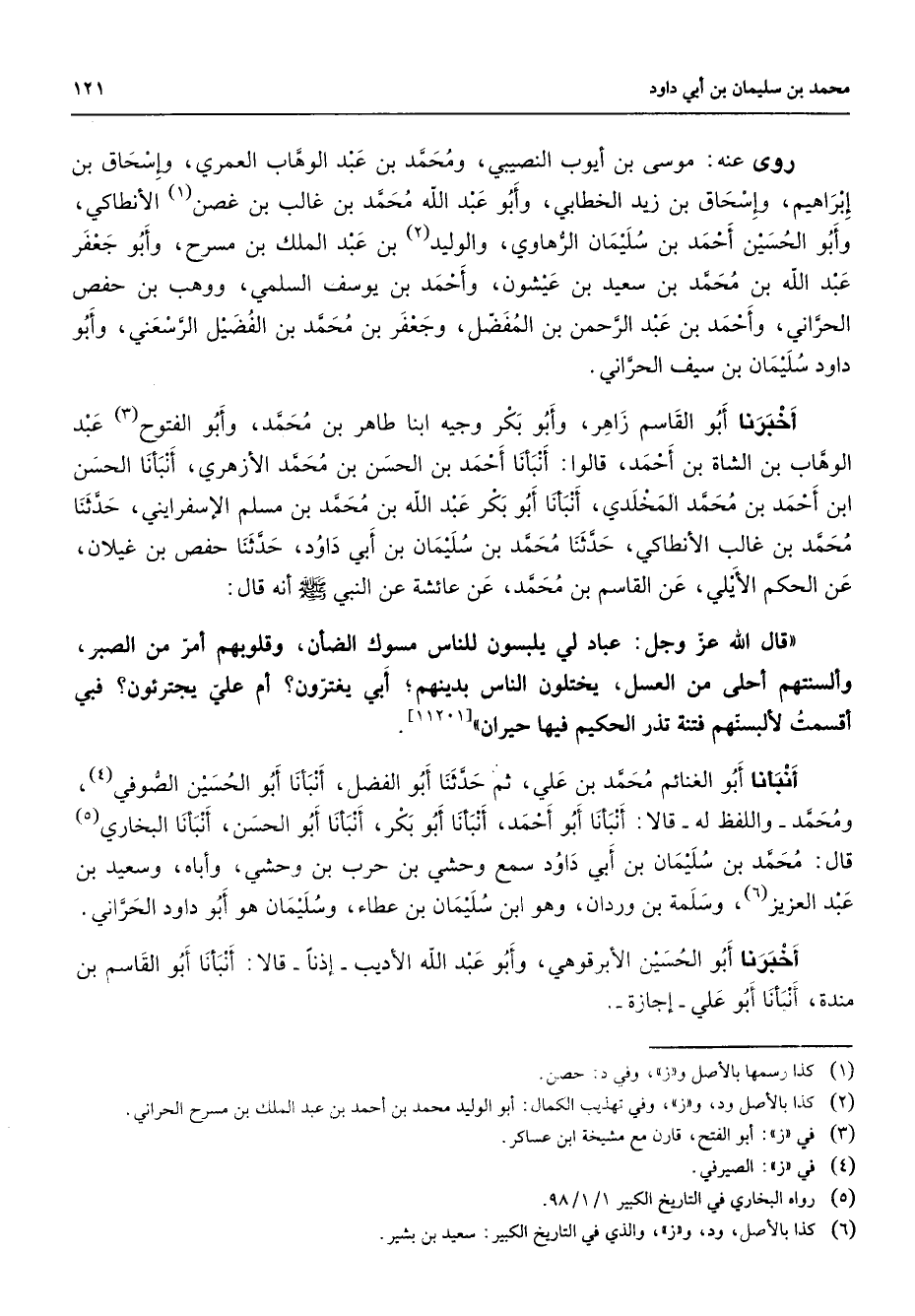 [11201] أنبأنا أبو الغنائم محمد بن علي ثم حدثنا أبو الفضل أنبأنا أبو الحسين الصوفي (4) ومحمد واللفظ له قالا أنبأنا أبو أحمد أنبأنا أبو بكر أنبأنا أبو الحسن أنبأنا البخاري (5) قال محمد بن سليمان بن أبي داود سمع وحشي بن حرب بن وحشي وأباه وسعيد بن عبد العزيز (6) وسلمة بن وردان وهو ابن سليمان بن عطاء وسليمان هو أبو داود الحراني خبرنا أخبرنا أبو الحسين الأبرقوهي وأبو عبد الله الأديب إذنا قالا أنبأنا أبو القاسم بن مندة أنبأنا أبو علي إجازة