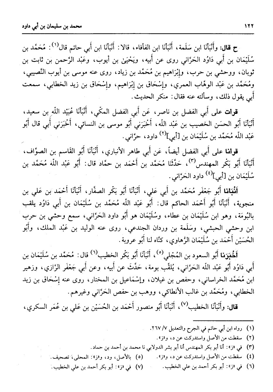 ح قال وأنبأنا ابن سلمة أنبأنا ابن الفأفاء قالا أنبأنا ابن أبي حاتم قال (1) محمد بن سليمان بن أبي داود الحراني روى عن أبيه ويحيى بن أيوب وعبد الرحمن بن ثابت بن ثوبان ووحشي بن حرب وإبراهيم بن محمد بن زياد روى عنه موسى بن أيوب النصيبي ومحمد بن عبد الوهاب العمري وإسحاق بن إبراهيم وإسحاق بن زيد الخطابي سمعت أبي يقول ذلك وسألته عنه فقال منكر الحديث قرأت على أبي الفضل بن ناصر عن أبي الفضل المكي أنبأنا عبيد الله بن سعيد أنبأنا أبو الحسن الخصيب بن عبد الله أخبرني أبو موسى بن النسائي أخبرني أبي قال أبو عبد الله محمد بن سليمان بن أبي (2) داود حراني قرأنا على أبي الفضل أيضا عن أبي طاهر الأنباري أنبأنا أبو القاسم بن الصواف أنبأنا أبو بكر المهندس (3) حدثنا محمد بن أحمد بن حماد قال أبو عبد الله محمد بن سليمان بن أبي (4) داود الحراني أنبأنا أبو جعفر محمد بن أبي علي أنبأنا أبو بكر الصفار أنبأنا أحمد بن علي بن منجوية أنبأنا أبو أحمد الحاكم قال أبو عبد الله محمد بن سليمان بن أبي داود يلقب بالبومة وهو ابن سليمان بن عطاء وسليمان هو أبو داود الحراني سمع وحشي بن حرب ابن وحشي الحبشي وسلمة بن وردان الجندعي روى عنه الوليد بن عبد الملك وأبو الحسين أحمد بن سليمان الرهاوي كناه لنا أبو عروبة أخبرنا أبو السعود بن المجلي (5) أنبأنا أبو بكر الخطيب (6) قال محمد بن سليمان بن أبي داود أبو عبد الله الحراني يلقب بومة حدث عن أبيه وعن أبي جعفر الرازي وزهير ابن محمد الخراساني وحفص بن غيلان وإسماعيل بن المختار روى عنه إسحاق بن زيد الخطابي ومحمد بن غالب الأنطاكي ووهب بن حفص الحراني وغيرهم قال وأنبأنا الخطيب (7) أنبأنا أبو منصور أحمد بن الحسين بن علي بن عمر السكري