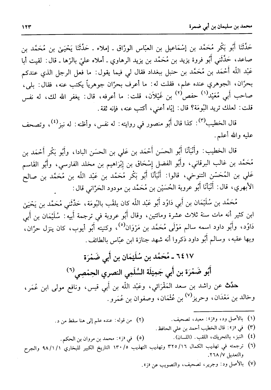 6417 - محمد بن سليمان بن أبي ضمرة أبو ضمرة بن أبي جميلة السلمي النصري الحمصي (6) حدث عن راشد بن سعد المقرائي وعبد الله بن أبي قيس ونافع مولى ابن عمر وخالد بن معدان وحريز (7) بن عثمان وصفوان بن عمرو