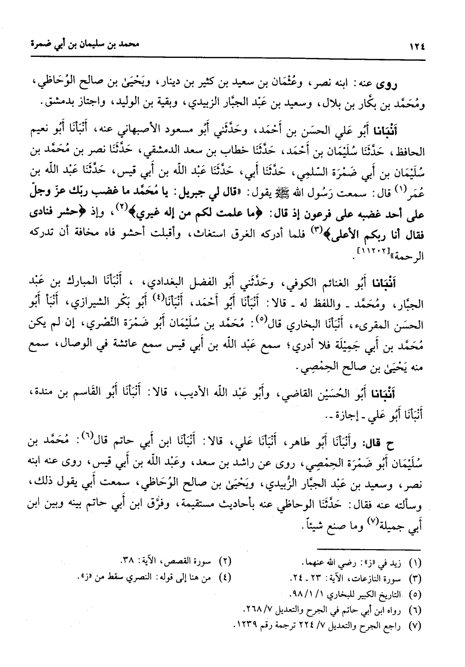 روى عنه ابنه نصر وعثمان بن سعيد بن كثير بن دينار ويحيى بن صالح الوحاظي ومحمد بن بكار بن بلال وسعيد بن عبد الجبار الزبيدي وبقية بن الوليد واجتاز بدمشق أنبأنا أبو علي الحسن بن أحمد وحدثني أبو مسعود الأصبهاني عنه أنبأنا أبو نعيم الحافظ حدثنا سليمان بن أحمد حدثنا خطاب بن سعد الدمشقي حدثنا نصر بن محمد بن سليمان بن أبي ضمرة السلمي حدثنا أبي حدثنا عبد الله بن أبي قيس حدثنا عبد الله بن عمر (1) قال سمعت رسول الله (صلى الله عليه وسلم) يقول قال لي جبريل يا محمد ما غضب ربك عز وجل على أحد غضبه على فرعون إذ قال " ما علمت لكم من إله غيري " (2) وإذ " حشر فنادى فقال أنا ربكم الأعلى " (3) فلما أدركه الغرق استغاث وأقبلت أحشو فاه مخافة أن تدركه الرحمة