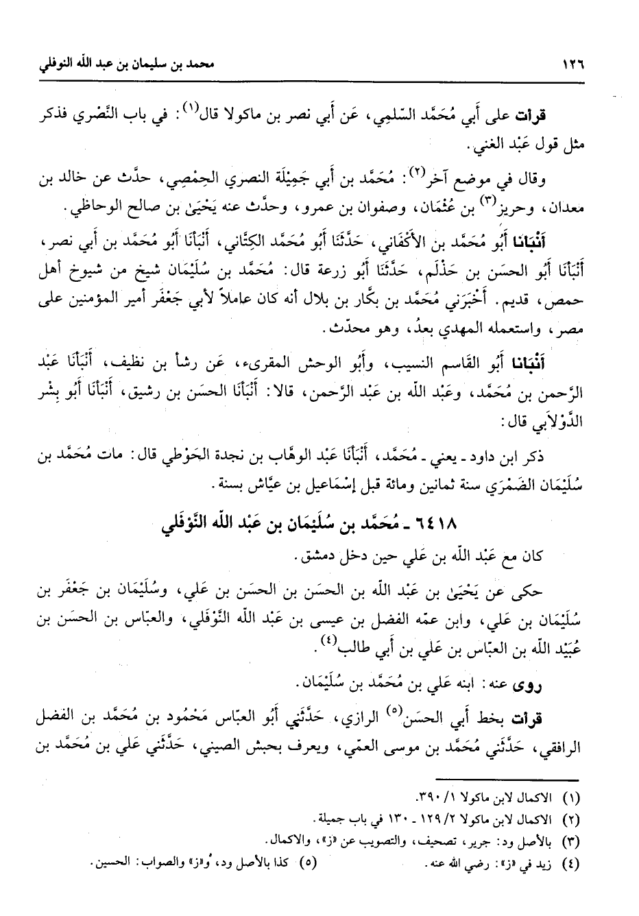 6418 - محمد بن سليمان بن عبد الله النوفلي كان مع عبد الله بن علي حين دخل دمشق حكى عن يحيى بن عبد الله بن الحسن بن الحسن بن علي وسليمان بن جعفر بن سليمان بن علي وابن عمه الفضل بن عيسى بن عبد الله النوفلي والعباس بن الحسن بن عبيد الله بن العباس بن علي بن أبي طالب (4) روى عنه ابنه علي بن محمد بن سليمان قرأت بخط أبي الحسن (5) الرازي حدثني أبو العباس محمود بن محمد بن الفضل الرافقي حدثني محمد بن موسى العمي ويعرف بحبش الصيني حدثني علي بن محمد بن