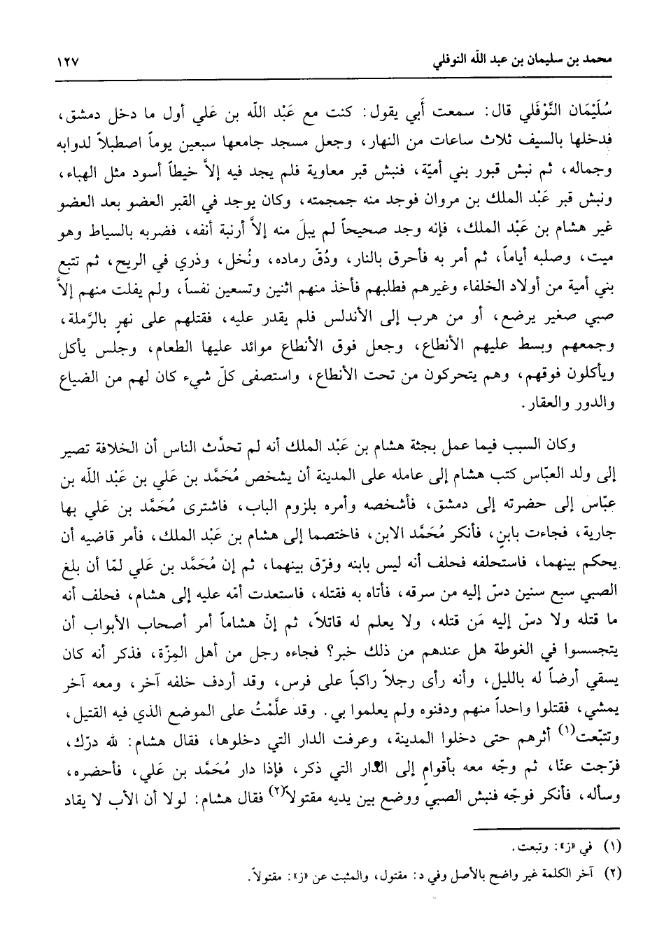 سليمان النوفلي قال سمعت أبي يقول كنت مع عبد الله بن علي أول ما دخل دمشق فدخلها بالسيف ثلاث ساعات من النهار وجعل مسجد جامعها سبعين يوما اصطبلا لدوابه وجماله ثم نبش قبور بني أمية فنبش قبر معاوية فلم يجد فيه إلا خيطا أسود مثل الهباء ونبش قبر عبد الملك بن مروان فوجد منه جمجمته وكان يوجد في القبر العضو بعد العضو غير هشام بن عبد الملك فإنه وجد صحيحا لم يبل منه إلا أرنبة أنفه فضربه بالسياط وهو ميت وصلبه أياما ثم أمر به فأحرق بالنار ودق رماده ونخل وذري في الريح ثم تتبع بني أمية من أولاد الخلفاء وغيرهم فطلبهم فأخذ منهم اثنين وتسعين نفسا ولم يفلت منهم إلا صبي صغير يرضع أو من هرب إلى الأندلس فلم يقدر عليه فقتلهم على نهر بالرملة وجمعهم وبسط عليهم الأنطاع وجعل فوق الأنطاع موائد عليها الطعام وجلس يأكل ويأكلون فوقهم وهم يتحركون من تحت الأنطاع واستصفى كل شئ كان لهم من الضياع والدور والعقار وكان السبب فيما عمل بجثة هشام بن عبد الملك أنه لم تحدث الناس أن الخلافة تصير إلى ولد العباس كتب هشام إلى عامله على المدينة أن يشخص محمد بن علي بن عبد الله بن عباس إلى حضرته إلى دمشق فأشخصه وأمره بلزوم الباب فاشترى محمد بن علي بها جارية فجاءت بابن فأنكر محمد الابن فاختصما إلى هشام بن عبد الملك فأمر قاضيه أن يحكم بينهما فاستحلفه فحلف أنه ليس بابنه وفرق بينهما ثم إن محمد بن علي لما أن بلغ الصبي سبع سنين دس إليه من سرقه فأتاه به فقتله فاستعدت أمه عليه إلى هشام فحلف أنه ما قتله ولا دس إليه من قتله ولا يعلم له قاتلا ثم إن هشاما أمر أصحاب الأبواب أن يتجسسوا في الغوطة هل عندهم من ذلك خبر فجاءه رجل من أهل المزة فذكر أنه كان يسقي أرضا له بالليل وأنه رأى رجلا راكبا على فرس وقد أردف خلفه آخر ومعه آخر يمشي فقتلوا واحدا منهم ودفنوه ولم يعلموا بي وقد علمت على الموضع الذي فيه القتيل وتتبعت أثرهم حتى دخلوا المدينة وعرفت الدار التي دخلوها فقال هشام لله درك فرجت عنا ثم وجه معه بأقوام إلى الدار التي ذكر فإذا دار محمد بن علي فأحضره وسأله فأنكر فوجه فنبش الصبي ووضع بين يديه مقتولا فقال هشام لولا أن الأب لا يقاد