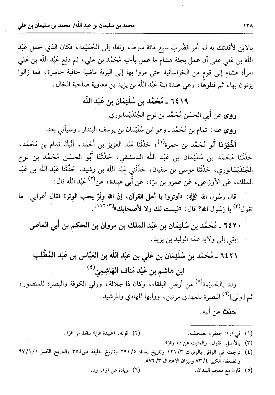 6421 - محمد بن سليمان بن علي بن عبد الله بن العباس بن عبد المطلب ابن هاشم بن عبد مناف الهاشمي (4) ولد بالحميمة (5) من أرض البلقاء وكان ذا جلالة وولي الكوفة والبصرة للمنصور ثم ولي (6) البصرة للمهدي مرتين ووليها للهادي وللرشيد حدث عنه أبيه