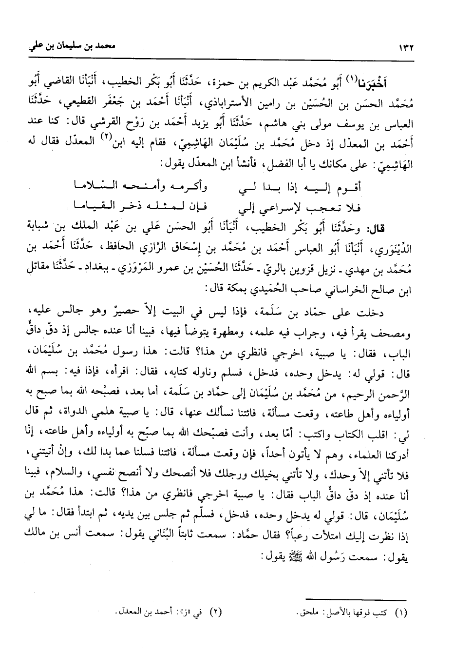 أخبرنا (1) أبو محمد عبد الكريم بن حمزة حدثنا أبو بكر الخطيب أنبأنا القاضي أبو محمد الحسن بن الحسين بن رامين الأستراباذي أنبأنا أحمد بن جعفر القطيعي حدثنا العباس بن يوسف مولى بني هاشم حدثنا أبو يزيد أحمد بن روح القرشي قال كنا عند أحمد بن المعدل إذ دخل محمد بن سليمان الهاشمي فقام إليه ابن (2) المعدل فقال له الهاشمي على مكانك يا أبا الفضل فأنشأ ابن المعدل يقول * أقوم إليه إذا بدا لي * وأكرمه وأمنحه السلاما فلا تعجب لإسراعي إلي * فإن لمثله ذخر القياما * قال وحدثنا أبو بكر الخطيب أنبأنا أبو الحسن علي بن عبد الملك بن شبابة الدينوري أنبأنا أبو العباس أحمد بن محمد بن إسحاق الرازي الحافظ حدثنا أحمد بن محمد بن مهدي نزيل قزوين بالري حدثنا الحسين بن عمرو المروزي ببغداد حدثنا مقاتل ابن صالح الخراساني صاحب الحميدي بمكة قال دخلت على حماد بن سلمة فإذا ليس في البيت إلا حصير وهو جالس عليه ومصحف يقرأ فيه وجراب فيه علمه ومطهرة يتوضأ فيها فبينا أنا عنده جالس إذ دق داق الباب فقال يا صبية اخرجي فانظري من هذا قالت هذا رسول محمد بن سليمان قال قولي له يدخل وحده فدخل فسلم وناوله كتابه فقال اقرأه فإذا فيه بسم الله الرحمن الرحيم من محمد بن سليمان إلى حماد بن سلمة أما بعد فصبحه الله بما صبح به أولياءه وأهل طاعته وقعت مسألة فائتنا نسألك عنها قال يا صبية هلمي الدواة ثم قال لي اقلب الكتاب واكتب أما بعد وأنت فصبحك الله بما صبح به أولياءه وأهل طاعته إنا أدركنا العلماء وهم لا يأتون أحدا فإن وقعت مسألة فائتنا فسلنا عما بدا لك وإن أتيتني فلا تأتني إلا وحدك ولا تأتني بخيلك ورجلك فلا أنصحك ولا أنصح نفسي والسلام فبينا أنا عنده إذ دق داق الباب فقال يا صبية اخرجي فانظري من هذا قالت هذا محمد بن سليمان قال قولي له يدخل وحده فدخل فسلم ثم جلس بين يديه ثم ابتدأ فقال ما لي إذا نظرت إليك امتلأت رعبا فقال حماد سمعت ثابتا البناني يقول سمعت أنس بن مالك يقول سمعت رسول الله (صلى الله عليه وسلم) يقول