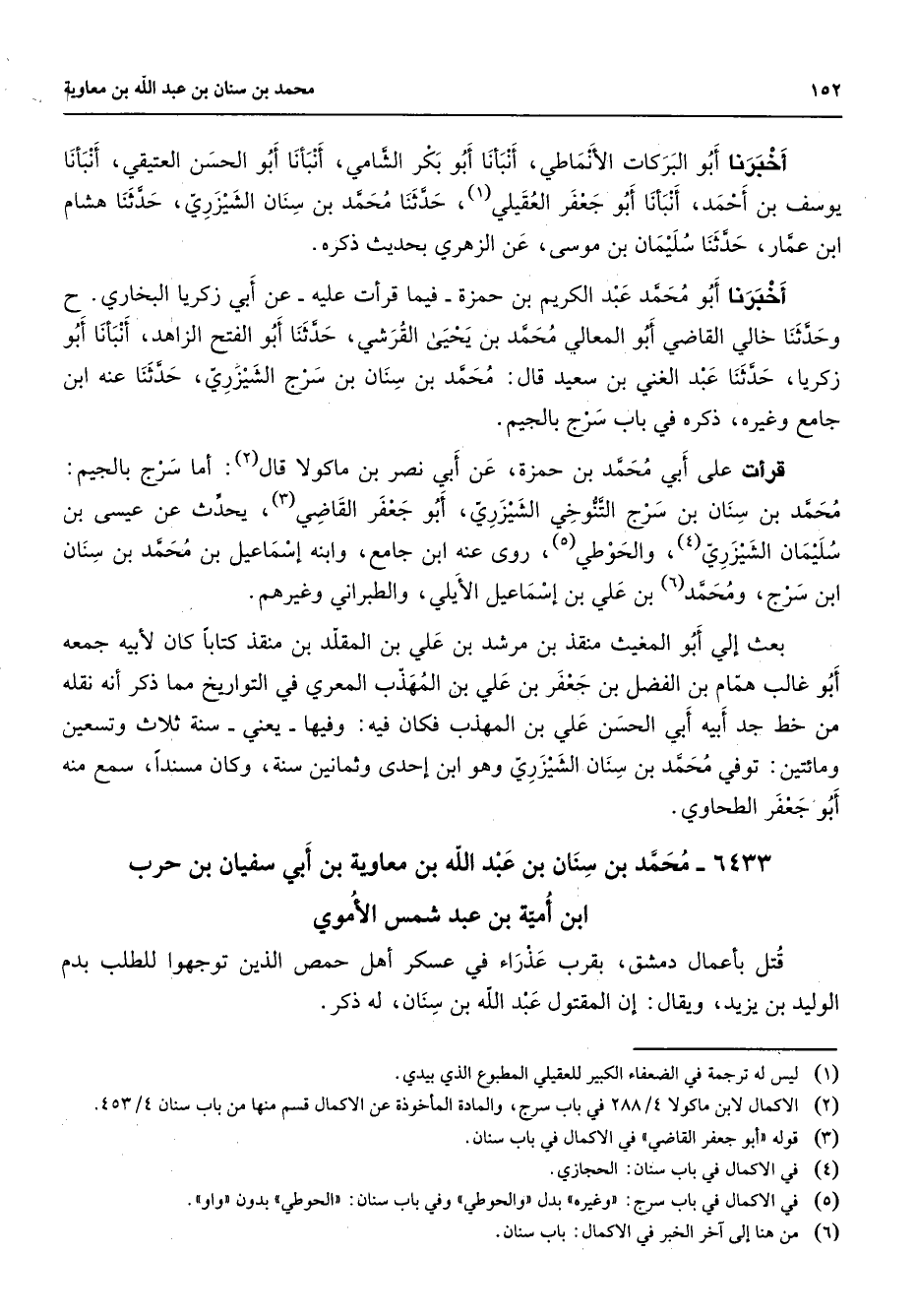 6433 - محمد بن سنان بن عبد الله بن معاوية بن أبي سفيان بن حرب ابن أمية بن عبد شمس الأموي قتل بأعمال دمشق بقرب عذراء في عسكر أهل حمص الذين توجهوا للطلب بدم الوليد بن يزيد ويقال إن المقتول عبد الله بن سنان له ذكر * (الوليد بن يزيد ويقال إن المقتول عبد الله بن سنان له ذكر