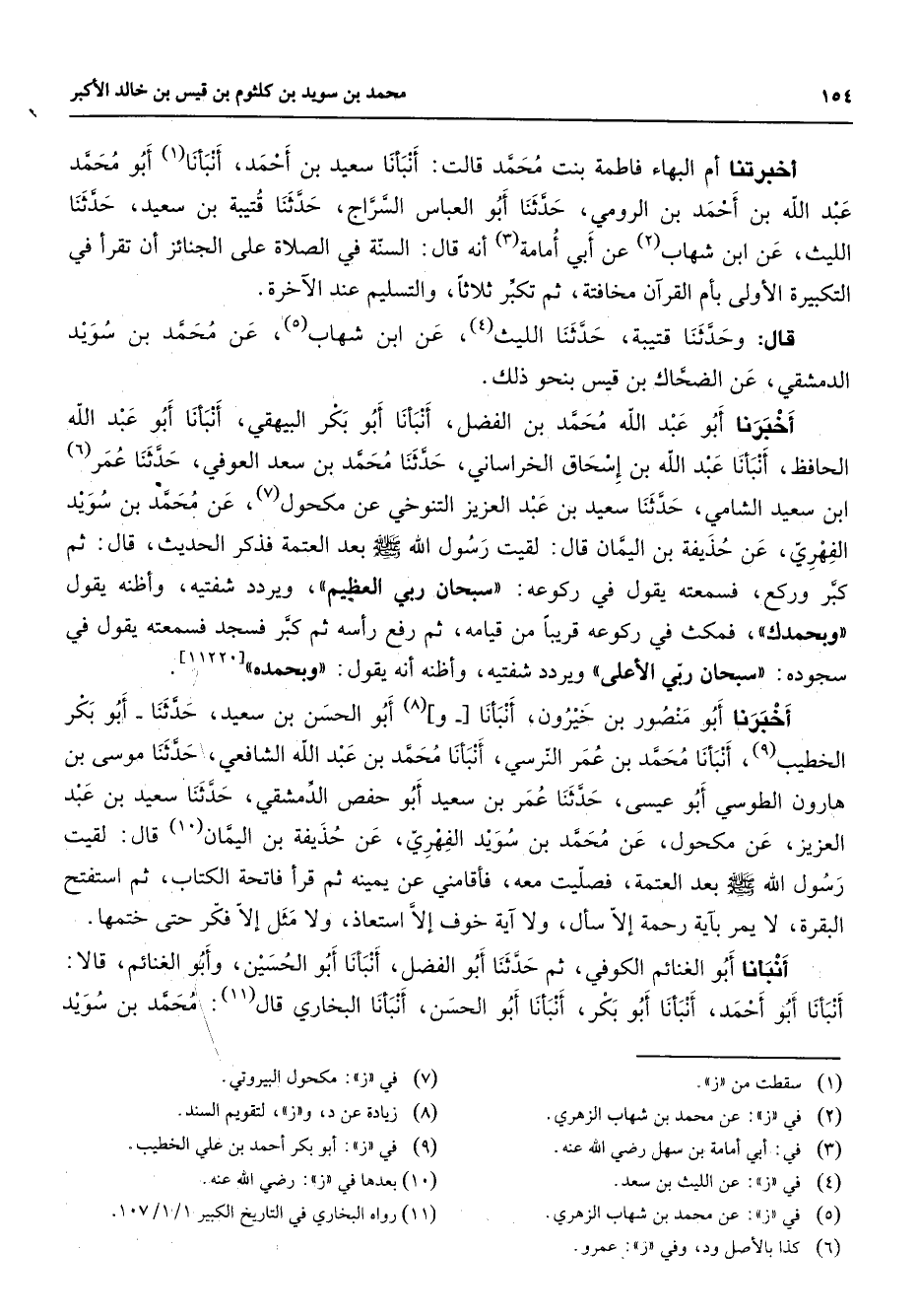 أخبرتنا أم البهاء فاطمة بنت محمد قالت أنبأنا سعيد بن أحمد أنبأنا (1) أبو محمد عبد الله بن أحمد بن الرومي حدثنا أبو العباس السراج حدثنا قتيبة بن سعيد حدثنا الليث عن ابن شهاب (3) عن أبي أمامة (4) أنه قال السنة في الصلاة على الجنائز أن تقرأ في التكبيرة الأولى بأم القرآن مخافتة ثم تكبر ثلاثا والتسليم عند الآخرة قال وحدثنا قتيبة حدثنا الليث (4) عن ابن شهاب (5) عن محمد بن سويد الدمشقي عن الضحاك بن قيس بنحو ذلك أخبرنا أبو عبد الله محمد بن الفضل أنبأنا أبو بكر البيهقي أنبأنا أبو عبد الله الحافظ أنبأنا عبد الله بن إسحاق الخراساني حدثنا محمد بن سعد العوفي حدثنا عمر (6) ابن سعيد الشامي حدثنا سعيد بن عبد العزيز التنوخي عن مكحول (7) عن محمد بن سويد الفهري عن حذيفة بن اليمان قال لقيت رسول الله (صلى الله عليه وسلم) بعد العتمة فذكر الحديث قال ثم كبر وركع فسمعته يقول في ركوعه سبحان ربي العظيم ويردد شفتيه وأظنه يقول وبحمدك فمكث في ركوعه قريبا من قيامه ثم رفع رأسه ثم كبر فسجد فسمعته يقول في سجوده سبحان ربي الأعلى ويردد شفتيه وأظنه أنه يقول وبحمده