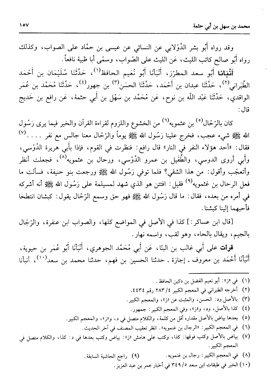 وقد رواه أبو بشر الدولابي عن النسائي عن عيسى بن حماد على الصواب وكذلك رواه أبو صالح كاتب الليث عن الليث على الصواب وسمى أبا ظبية نافعا أنبأنا أبو سعد المطرز أنبأنا أبو نعيم الحافظ (1) حدثنا سليمان بن أحمد الطبراني (2) حدثنا عبدان بن أحمد حدثنا الحسن (3) بن جهور (4) حدثنا محمد بن عمر الواقدي حدثنا عبد الله بن نوح عن محمد بن سهل بن أبي حثمة عن رافع بن خديج قال كان بالرحال (5) بن عثمويه (6) من الخشوع واللزوم لقراءة القرآن والخير فيما يرى رسول الله (صلى الله عليه وسلم) شئ عجب فخرج علينا رسول الله (صلى الله عليه وسلم) يوما والرحال معنا جالس مع نفر (7) فقال أحد هؤلاء النفر في النار قال رافع فنظرت في القوم فإذا بأبي هريرة الدوسي وأبي أروى الدوسي والطفيل بن عمرو الدوسي ورحال بن عثمويه (8) فجعلت أنظر وأتعجب وأقول من هذا الشقي فلما توفي رسول الله (صلى الله عليه وسلم) ورجعت بنو حنيفة فسألت ما فعل الرحال بن غثمويه (9) فقيل افتتن هو الذي شهد لمسيلمة على رسول الله (صلى الله عليه وسلم) أنه أشركه في أمره من بعده فقال ما قال رسول الله (صلى الله عليه وسلم) فهو حق وسمع الرحال يقول كبشان انتطحا فأحبهما إلينا كبشنا قال ابن عساكر كذا في الأصل في المواضع كلها والصواب ابن عنفرة والرجال بالجيم ويقال بالحاء وهو لقب واسمه نهار قرأت على أبي غالب بن البنا عن أبي محمد الجوهري أنبأنا أبو عمر بن حيوية أنبأنا أحمد بن معروف إجازة حدثنا الحسين بن فهم حدثنا محمد بن سعد (10) أنبأنا