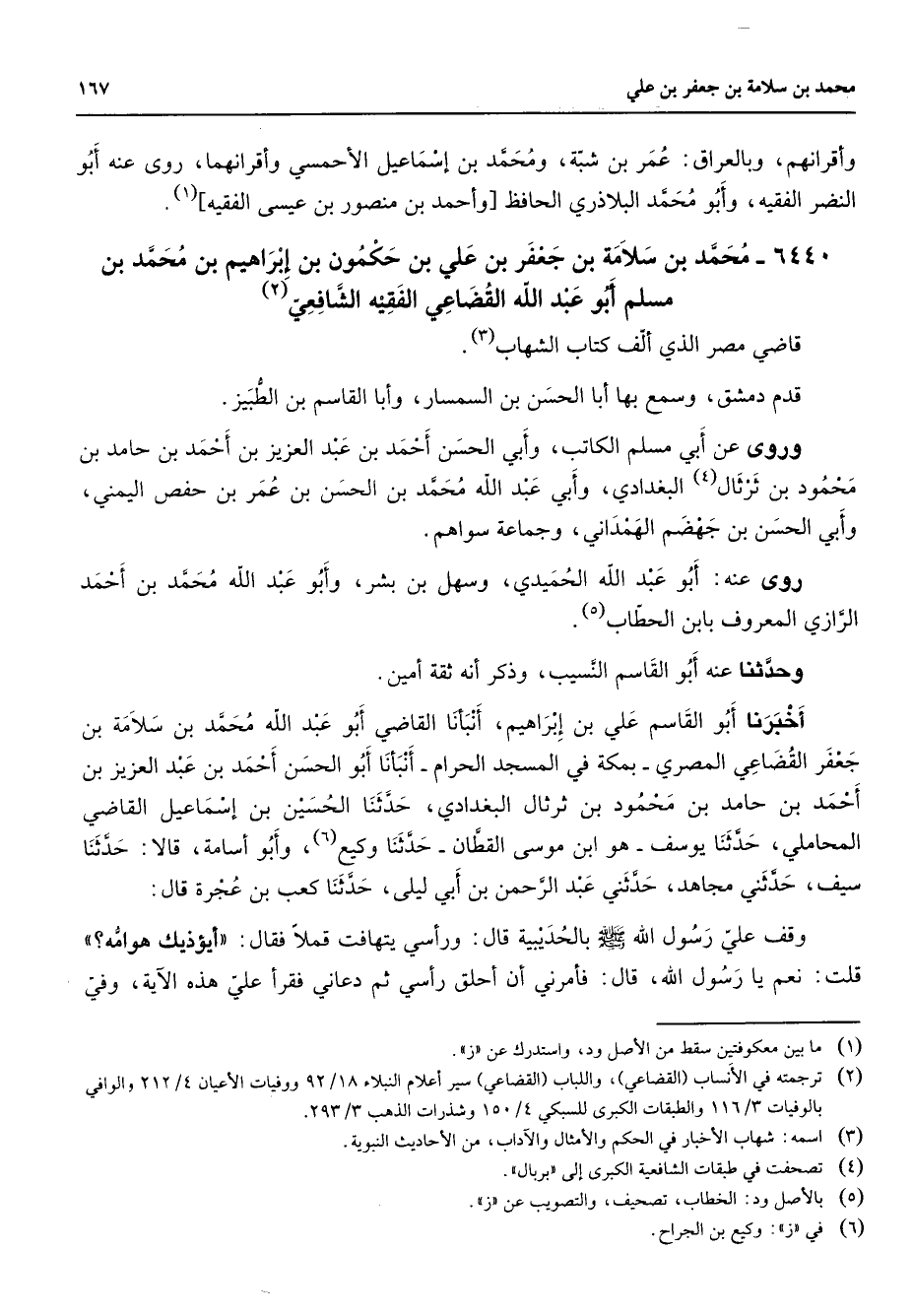6440 - محمد بن سلامة بن جعفر بن علي بن حكمون بن إبراهيم بن محمد بن مسلم أبو عبد الله القضاعي الفقيه الشافعي (2) قاضي مصر الذي ألف كتاب الشهاب (3) قدم دمشق وسمع بها أبا الحسن بن السمسار وأبا القاسم بن الطبيز وروى عن أبي مسلم الكاتب وأبي الحسن أحمد بن عبد العزيز بن أحمد بن حامد بن محمود بن ثرثال (4) البغدادي وأبي عبد الله محمد بن الحسن بن عمر بن حفص اليمني وأبي الحسن بن جهضم الهمداني وجماعة سواهم روى عنه أبو عبد الله الحميدي وسهل بن بشر وأبو عبد الله محمد بن أحمد الرازي المعروف بابن الحطاب (5) وحدثنا عنه أبو القاسم النسيب وذكر أنه ثقة أمين أخبرنا أبو القاسم علي بن إبراهيم أنبأنا القاضي أبو عبد الله محمد بن سلامة بن جعفر القضاعي المصري بمكة في المسجد الحرام أنبأنا أبو الحسن أحمد بن عبد العزيز بن أحمد بن حامد بن محمود بن ثرثال البغدادي حدثنا الحسين بن إسماعيل القاضي المحاملي حدثنا يوسف هو ابن موسى القطان حدثنا وكيع (6) وأبو أسامة قالا حدثنا سيف حدثني مجاهد حدثني عبد الرحمن بن أبي ليلى حدثنا كعب بن عجرة قال وقف علي رسول الله (صلى الله عليه وسلم) بالحديبية قال ورأسي يتهافت قملا فقال أيؤذيك هوامه قلت نعم يا رسول الله قال فأمرني أن أحلق رأسي ثم دعاني فقرا علي هذه الآية وفي