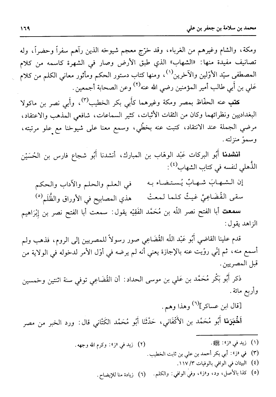 ومكة والشام وغيرهم من الغرباء وقد خرج معجم شيوخه الذين رآهم سفرا وحضرا وله تصانيف مفيدة منها الشهاب الذي طبق الأرض وصار في الشهرة كاسمه من كلام المصطفى سيد الأولين والآخرين (1) ومنها كتاب دستور الحكم ومأثور معاني الكلم من كلام علي بن أبي طالب أمير المؤمنين Bهـ (2) وعن الصحابة أجمعين كتب عنه الحفاظ بمصر ومكة وغيرهما كأبي بكر الخطيب (3) وأبي نصر بن ماكولا البغداديين ونظرائهما وكان من الثقات الأثبات كثير السماعات شافعي المذهب والاعتقاد مرضي الجملة عند الانتقاد كتبت عنه بخطي وسمع معنا على شيوخنا مع علو مرتبته وسمو منزلته أنشدنا أبو البركات عبد الوهاب بن المبارك أنشدنا أبو شجاع فارس بن الحسين الذهلي لنفسه في كتاب الشهاب (4) * إن الشهاب شهاب يستضاء به * في العلم والحلم والآداب والحكم سقى القضاعي غيث كلما لمعت * هذي المصابيح في الأوراق والظلم * (5) سمعت أبا الفتح نصر الله بن محمد الفقيه يقول سمعت أبا الفتح نصر بن إبراهيم الزاهد يقول قدم علينا القاضي أبو عبد الله القضاعي صور رسولا للمصريين إلى الروم فذهب ولم أسمع منه ثم إني رويت عنه بالإجازة يعني أنه لم يرضه في أول الأمر لدخوله في الولاية من قبل المصريين ذكر أبو بكر محمد بن علي بن موسى الحداد أن القضاعي توفي سنة اثنتين وخمسين وأربع مائة قال ابن عساكر (6) وهذا وهم أخبرنا أبو محمد بن الأكفاني حدثنا أبو محمد الكتاني قال ورد الخبر من مصر