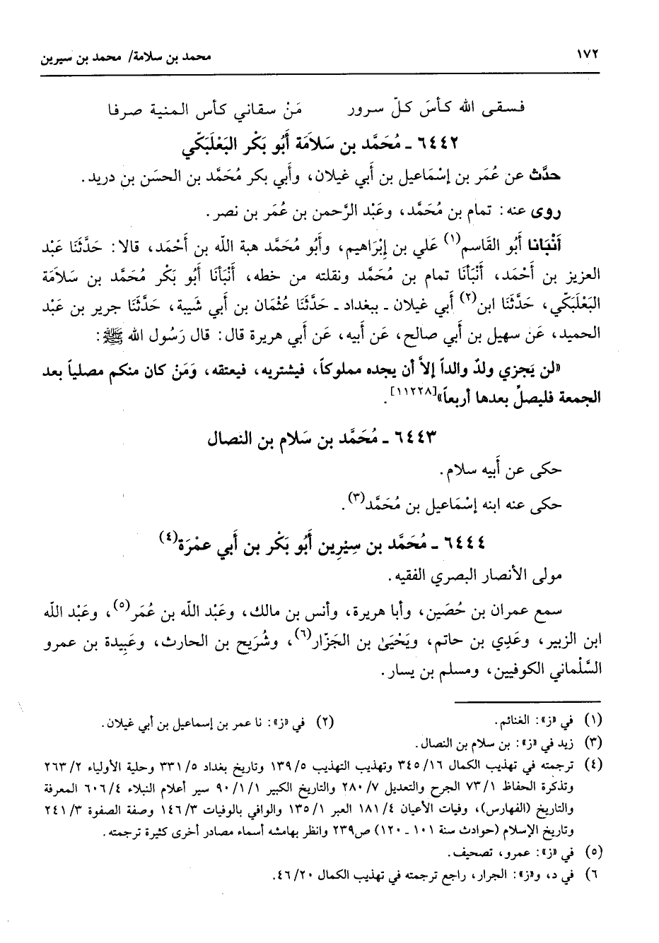 6442 - محمد بن سلامة أبو بكر البعلبكي حدث عن عمر بن إسماعيل بن أبي غيلان وأبي بكر محمد بن الحسن بن دريد روى عنه تمام بن محمد وعبد الرحمن بن عمر بن نصر أنبأنا أبو القاسم (1) علي بن إبراهيم وأبو محمد هبة الله بن أحمد قالا حدثنا عبد العزيز بن أحمد أنبأنا تمام بن محمد ونقلته من خطه أنبأنا أبو بكر محمد بن سلامة البعلبكي حدثنا ابن (2) أبي غيلان ببغداد حدثنا عثمان بن أبي شيبة حدثنا جرير بن عبد الحميد عن سهيل بن أبي صالح عن أبيه عن أبي هريرة قال قال رسول الله (صلى الله عليه وسلم) لن يجزي ولد والدا إلا أن يجده مملوكا فيشتريه فيعتقه ومن كان منكم مصليا بعد الجمعة فليصل بعدها أربعا