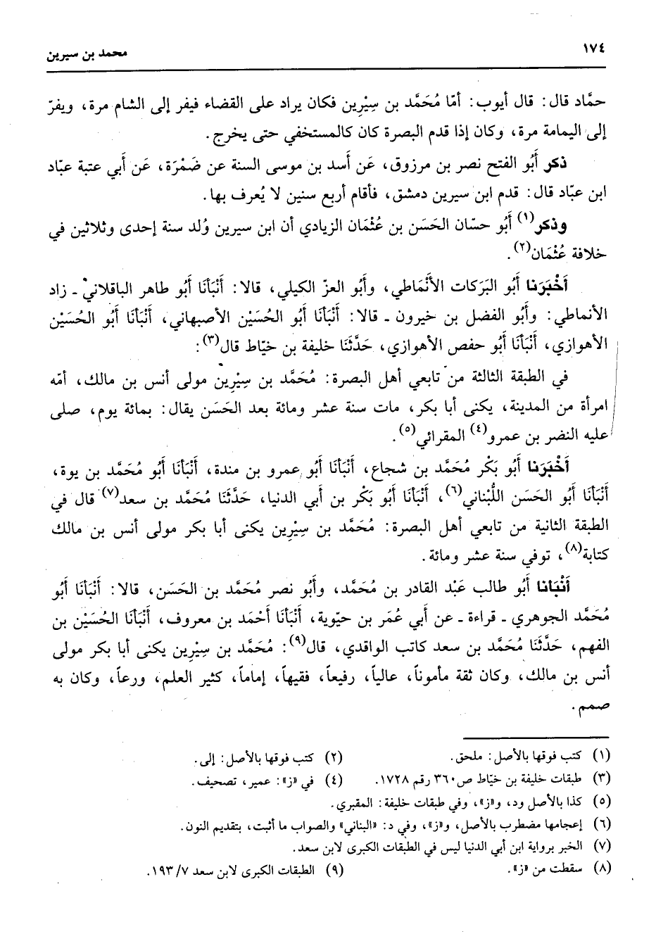 حماد قال قال أيوب أما محمد بن سيرين فكان يراد على القضاء فيفر إلى الشام مرة ويفر إلى اليمامة مرة وكان إذا قدم البصرة كان كالمستخفي حتى يخرج ذكر أبو الفتح نصر بن مرزوق عن أسد بن موسى السنة عن ضمرة عن أبي عتبة عباد ابن عباد قال قدم ابن سيرين دمشق فأقام أربع سنين لا يعرف بها وذكر (1) أبو حسان الحسن بن عثمان الزيادي أن ابن سيرين ولد سنة إحدى وثلاثين في خلافة عثمان (2) أخبرنا أبو البركات الأنماطي وأبو العز الكيلي قالا أنبأنا أبو طاهر الباقلاني زاد الأنماطي وأبو الفضل بن خيرون قالا أنبأنا أبو الحسين الأصبهاني أنبأنا أبو الحسين الأهوازي أنبأنا أبو حفص الأهوازي حدثنا خليفة بن خياط قال (3) في الطبقة الثالثة من تابعي أهل البصرة محمد بن سيرين مولى أنس بن مالك أمه امرأة من المدينة يكنى أبا بكر مات سنة عشر ومائة بعد الحسن يقال بمائة يوم صلى عليه النضر بن عمرو (4) المقرائي (5) أخبرنا أبو بكر محمد بن شجاع أنبأنا أبو عمرو بن مندة أنبأنا أبو محمد بن يوة أنبأنا أبو الحسن اللبناني (6) أنبأنا أبو بكر بن أبي الدنيا حدثنا محمد بن سعد (7) قال في الطبقة الثانية من تابعي أهل البصرة محمد بن سيرين يكنى أبا بكر مولى أنس بن مالك كتابة (8) توفي سنة عشر ومائة أنبأنا أبو طالب عبد القادر بن محمد وأبو نصر محمد بن الحسن قالا أنبأنا أبو محمد الجوهري قراءة عن أبي عمر بن حيوية أنبأنا أحمد بن معروف أنبأنا الحسين بن الفهم حدثنا محمد بن سعد كاتب الواقدي قال (9) محمد بن سيرين يكنى أبا بكر مولى أنس بن مالك وكان ثقة مأمونا عاليا رفيعا فقيها إماما كثير العلم ورعا وكان به صمم