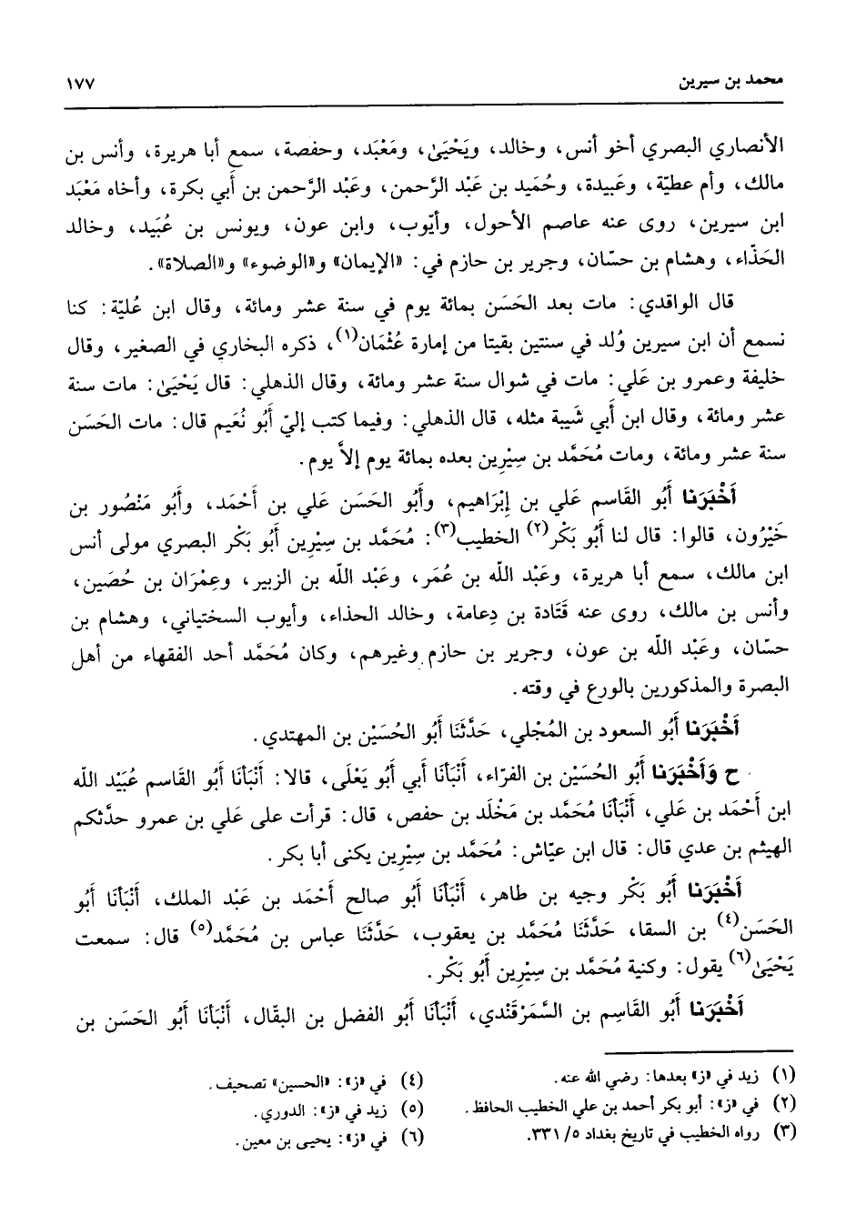 الأنصاري البصري أخو أنس وخالد ويحيى ومعبد وحفصة سمع أبا هريرة وأنس بن مالك وأم عطية وعبيدة وحميد بن عبد الرحمن وعبد الرحمن بن أبي بكرة وأخاه معبد ابن سيرين روى عنه عاصم الأحول وأيوب وابن عون ويونس بن عبيد وخالد الحذاء وهشام بن حسان وجرير بن حازم في الإيمان والوضوء والصلاة قال الواقدي مات بعد الحسن بمائة يوم في سنة عشر ومائة وقال ابن علية كنا نسمع أن ابن سيرين ولد في سنتين بقيتا من إمارة عثمان (1) ذكره البخاري في الصغير وقال خليفة وعمرو بن علي مات في شوال سنة عشر ومائة وقال الذهلي قال يحيى مات سنة عشر ومائة وقال ابن أبي شيبة مثله قال الذهلي وفيما كتب إلي أبو نعيم قال مات الحسن سنة عشر ومائة ومات محمد بن سيرين بعده بمائة يوم إلا يوم أخبرنا أبو القاسم علي بن إبراهيم وأبو الحسن علي بن أحمد وأبو منصور بن خيرون قالوا قال لنا أبو بكر (2) الخطيب (3) محمد بن سيرين أبو بكر البصري مولى أنس ابن مالك سمع أبا هريرة وعبد الله بن عمر وعبد الله بن الزبير وعمران بن حصين وأنس بن مالك روى عنه قتادة بن دعامة وخالد الحذاء وأيوب السختياني وهشام بن حسان وعبد الله بن عون وجرير بن حازم وغيرهم وكان محمد أحد الفقهاء من أهل البصرة والمذكورين بالورع في وقته أخبرنا أبو السعود بن المجلي حدثنا أبو الحسين بن المهتدي ح وأخبرنا أبو الحسين بن الفراء أنبأنا أبي أبو يعلى قالا أنبأنا أبو القاسم عبيد الله ابن أحمد بن علي أنبأنا محمد بن مخلد بن حفص قال قرأت على علي بن عمرو حدثكم الهيثم بن عدي قال قال ابن عياش محمد بن سيرين يكنى أبا بكر أخبرنا أبو بكر وجيه بن طاهر أنبأنا أبو صالح أحمد بن عبد الملك أنبأنا أبو الحسن (4) بن السقا حدثنا محمد بن يعقوب حدثنا عباس بن محمد (5) قال سمعت يحيى (6) يقول وكنية محمد بن سيرين أبو بكر أخبرنا أبو القاسم بن السمرقندي أنبأنا أبو الفضل بن البقال أنبأنا أبو الحسن بن