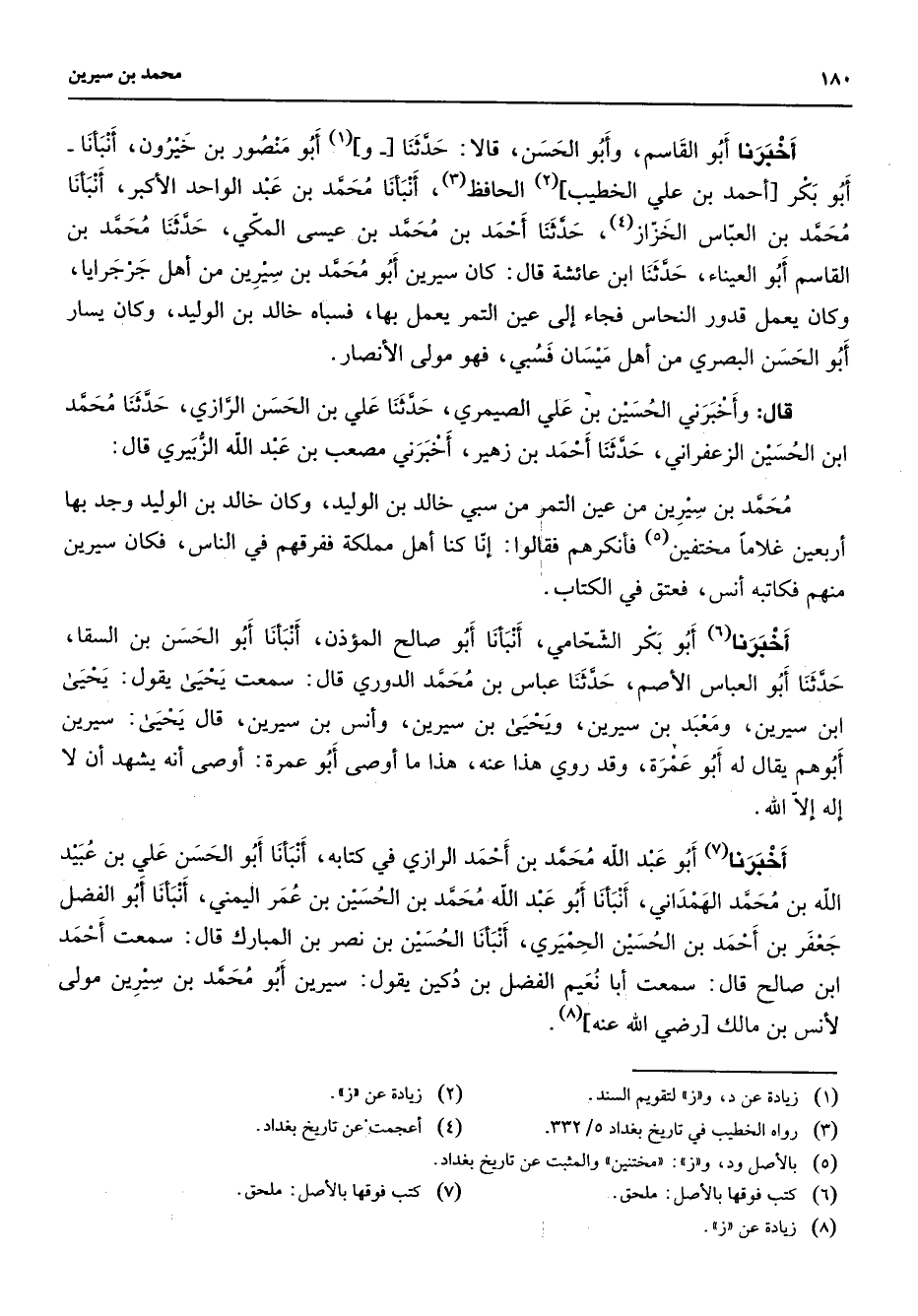أخبرنا أبو القاسم وأبو الحسن قالا حدثنا و (1) أبو منصور بن خيرون أنبأنا أبو بكر أحمد بن علي الخطيب (2) الحافظ (3) أنبأنا محمد بن عبد الواحد الأكبر أنبأنا محمد بن العباس الخزاز (4) حدثنا أحمد بن محمد بن عيسى المكي حدثنا محمد بن القاسم أبو العيناء حدثنا ابن عائشة قال كان سيرين أبو محمد بن سيرين من أهل جرجرايا وكان يعمل قدور النحاس فجاء إلى عين التمر يعمل بها فسباه خالد بن الوليد وكان يسار أبو الحسن البصري من أهل ميسان فسبي فهو مولى الأنصار قال وأخبرني الحسين بن علي الصيمري حدثنا علي بن الحسن الرازي حدثنا محمد ابن الحسين الزعفراني حدثنا أحمد بن زهير أخبرني مصعب بن عبد الله الزبيري قال محمد بن سيرين من عين التمر من سبي خالد بن الوليد وكان خالد بن الوليد وجد بها أربعين غلاما مختفين (5) فأنكرهم فقالوا إنا كنا أهل مملكة ففرقهم في الناس فكان سيرين منهم فكاتبه أنس فعتق في الكتاب أخبرنا (6) أبو بكر الشحامي أنبأنا أبو صالح المؤذن أنبأنا أبو الحسن بن السقا حدثنا أبو العباس الأصم حدثنا عباس بن محمد الدوري قال سمعت يحيى يقول يحيى ابن سيرين ومعبد بن سيرين ويحيى بن سيرين وأنس بن سيرين قال يحيى سيرين أبوهم يقال له أبو عمرة وقد روي هذا عنه هذا ما أوصى أبو عمرة أوصى أنه يشهد أن لا إله إلا الله أخبرنا (7) أبو عبد الله محمد بن أحمد الرازي في كتابه أنبأنا أبو الحسن علي بن عبيد الله بن محمد الهمداني أنبأنا أبو عبد الله محمد بن الحسين بن عمر اليمني أنبأنا أبو الفضل جعفر بن أحمد بن الحسين الحميري أنبأنا الحسين بن نصر بن المبارك قال سمعت أحمد ابن صالح قال سمعت أبا نعيم الفضل بن دكين يقول سيرين أبو محمد بن سيرين مولى لأنس بن مالك Bهـ (8)