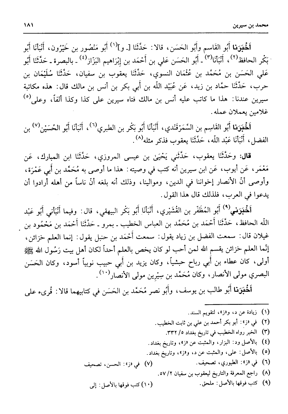 أخبرنا أبو القاسم وأبو الحسن قالا حدثنا و (1) أبو منصور بن خيرون أنبأنا أبو بكر الحافظ (2) أنبأنا (3) أبو الحسن علي بن أحمد بن إبراهيم البزاز (4) بالبصرة حدثنا أبو علي الحسن بن محمد بن عثمان النسوي حدثنا يعقوب بن سفيان حدثنا سليمان بن حرب حدثنا حماد بن زيد عن عبيد الله بن أبي بكر بن أنس بن مالك قال هذه مكاتبة سيرين عندنا هذا ما كاتب عليه أنس بن مالك فتاه سيرين على كذا وكذا ألفا وعلى (5) غلامين يعملان عمله أخبرنا أبو القاسم بن السمرقندي أنبأنا أبو بكر بن الطبري (6) أنبأنا أبو الحسين (7) بن الفضل أنبأنا عبد الله حدثنا يعقوب فذكر (8) مثله قال وحدثنا يعقوب حدثني يحيى بن عيسى المروزي حدثنا ابن المبارك عن معمر عن أيوب عن ابن سيرين أنه كتب في وصيته هذا ما أوصى به محمد بن أبي عمرة وأوصى أن الأنصار إخواننا في الدين وموالينا وذلك أنه بلغه أن ناسا من أهله أرادوا أن يدعوا في العرب فلذلك قال هذا القول أخبرني (9) أبو المظفر بن القشيري أنبأنا أبو بكر البيهقي قال وفيما أنبأني أبو عبد الله الحافظ حدثنا أحمد بن محمد بن العباس الخطيب بمرو حدثنا أحمد بن محمود بن غيلان قال عت غيلان قال سمعت الفضل بن زياد يقول سمعت أحمد بن حنبل يقول إنما العلم خزائن إنما العلم خزائن يقسم الله لمن أحب لو كان يخص بالعلم أحدا لكان أهل بيت رسول الله (صلى الله عليه وسلم) أولى كان عطاء بن أبي رباح حبشيا وكان يزيد بن أبي حبيب نوبيا أسود وكان الحسن البصري مولى الأنصار (10) وكان محمد بن سيرين مولى الأنصار أخبرنا أبو طالب بن يوسف وأبو نصر محمد بن الحسن في كتابيهما قالا قرئ على