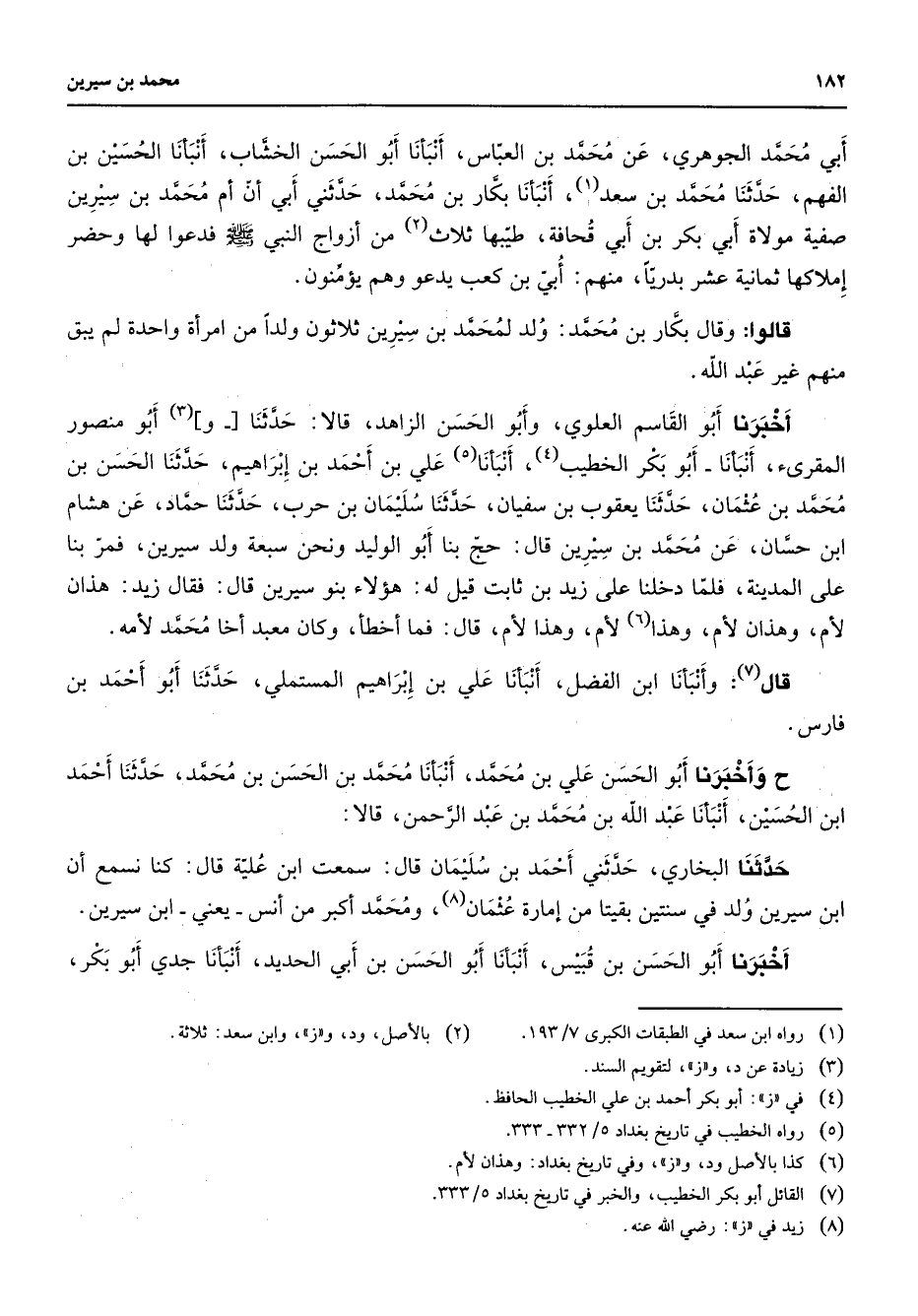 أبي محمد الجوهري عن محمد بن العباس أنبأنا أبو الحسن الخشاب أنبأنا الحسين بن الفهم حدثنا محمد بن سعد (1) أنبأنا بكار بن محمد حدثني أبي أن أم محمد بن سيرين صفية مولاة أبي بكر بن أبي قحافة طيبها ثلاث (2) من أزواج النبي (صلى الله عليه وسلم) فدعوا لها وحضر إملاكها ثمانية عشر بدريا منهم أبي بن كعب يدعو وهم يؤمنون قالوا وقال بكار بن محمد ولد لمحمد بن سيرين ثلاثون ولدا من امرأة واحدة لم يبق منهم غير عبد الله أخبرنا أبو القاسم العلوي وأبو الحسن الزاهد قالا حدثنا (3) وأبو منصور المقرئ أنبأنا أبو بكر الخطيب (4) أنبأنا (5) علي بن أحمد بن إبراهيم حدثنا الحسن بن محمد بن عثمان حدثنا يعقوب بن سفيان حدثنا سليمان بن حرب حدثنا حماد عن هشام ابن حسان عن محمد بن سيرين قال حج بنا أبو الوليد ونحن سبعة ولد سيرين فمر بنا على المدينة فلما دخلنا على زيد بن ثابت قيل له هؤلاء بنو سيرين قال فقال زيد هذان لأم وهذان لأم وهذا (6) لأم وهذا لأم قال فما أخطأ وكان معبد أخا محمد لأمه قال (7) وأنبأنا ابن الفضل أنبأنا علي بن إبراهيم المستملي حدثنا أبو أحمد بن فارس ح وأخبرنا أبو الحسن علي بن محمد أنبأنا محمد بن الحسن بن محمد حدثنا أحمد ابن الحسين أنبأنا عبد الله بن محمد بن عبد الرحمن قالا حدثنا البخاري حدثني أحمد بن سليمان قال سمعت ابن علية قال كنا نسمع أن ابن سيرين ولد في سنتين بقيتا من إمارة عثمان (8) ومحمد أكبر من أنس يعني ابن سيرين أخبرنا أبو الحسن بن قبيس أنبأنا أبو الحسن بن أبي الحديد أنبأنا جدي أبو بكر