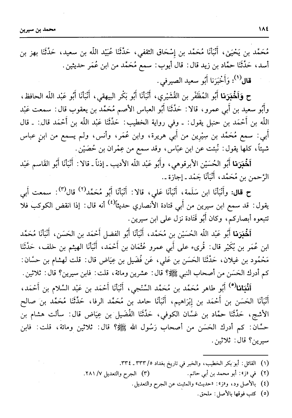 محمد بن يحيى أنبأنا محمد بن إسحاق الثقفي حدثنا عبيد الله بن سعيد حدثنا بهز بن أسد حدثنا حماد بن زيد قال قال أيوب سمع محمد من ابن عمر حديثين قال (1) وأخبرنا أبو سعيد الصيرفي ح وأخبرنا أبو المظفر بن القشيري أنبأنا أبو بكر البيهقي أنبأنا أبو عبد الله الحافظ وأبو سعيد بن أبي عمرو قالا حدثنا أبو العباس الأصم محمد بن يعقوب قال سمعت عبد الله بن أحمد بن حنبل يقول وفي رواية الخطيب حدثنا عبد الله بن أحمد قال قال أبي سمع محمد بن سيرين من أبي هريرة وابن عمر وأنس ولم يسمع من ابن عباس شيئا كلها يقول نبئت عن ابن عباس وقد سمع من عمران بن حصين أخبرنا أبو الحسين الأبرقوهي وأبو عبد الله الأديب إذنا قالا أنبأنا أبو القاسم عبد الرحمن بن محمد أنبأنا جمد إجازة ح قال وأنبأنا ابن سلمة أنبأنا علي قالا أنبانا أبو محمد (2) قال (3) سمعت أبي يقول قد سمع ابن سيرين من أبي قتادة الأنصاري حديثا (4) أنه قال إذا انقض الكوكب فلا تتبعوه أبصاركم وكان أبو قتادة نزل على ابن سيرين أخبرنا أبو عبد الله الحسين بن محمد أنبأنا أبو الفضل أحمد بن الحسن أنبأنا محمد ابن عمر بن بكير قال قرئ على أبي عمرو عثمان بن أحمد أنبأنا الهيثم بن خلف حدثنا محمود بن غيلان حدثنا الحسن بن علي عن فضيل بن عياض قال قلت لهشام بن حسان كم أدرك الحسن من أصحاب النبي (صلى الله عليه وسلم) قال عشرين ومائة قلت فابن سيرين قال ثلاثين أنبأنا (5) أبو طاهر محمد بن محمد السنجي أنبأنا أحمد بن عبد السلام بن أحمد أنبأنا الحسن بن أحمد بن إبراهيم أنبأنا حامد بن محمد الرفا حدثنا محمد بن صالح الأشج حدثنا حماد بن غسان الكوفي حدثنا الفضيل بن عياض قال سألت هشام بن حسان كم أدرك الحسن من أصحاب رسول الله (صلى الله عليه وسلم) قال ثلاثين ومائة قلت فابن سيرين قال ثلاثين