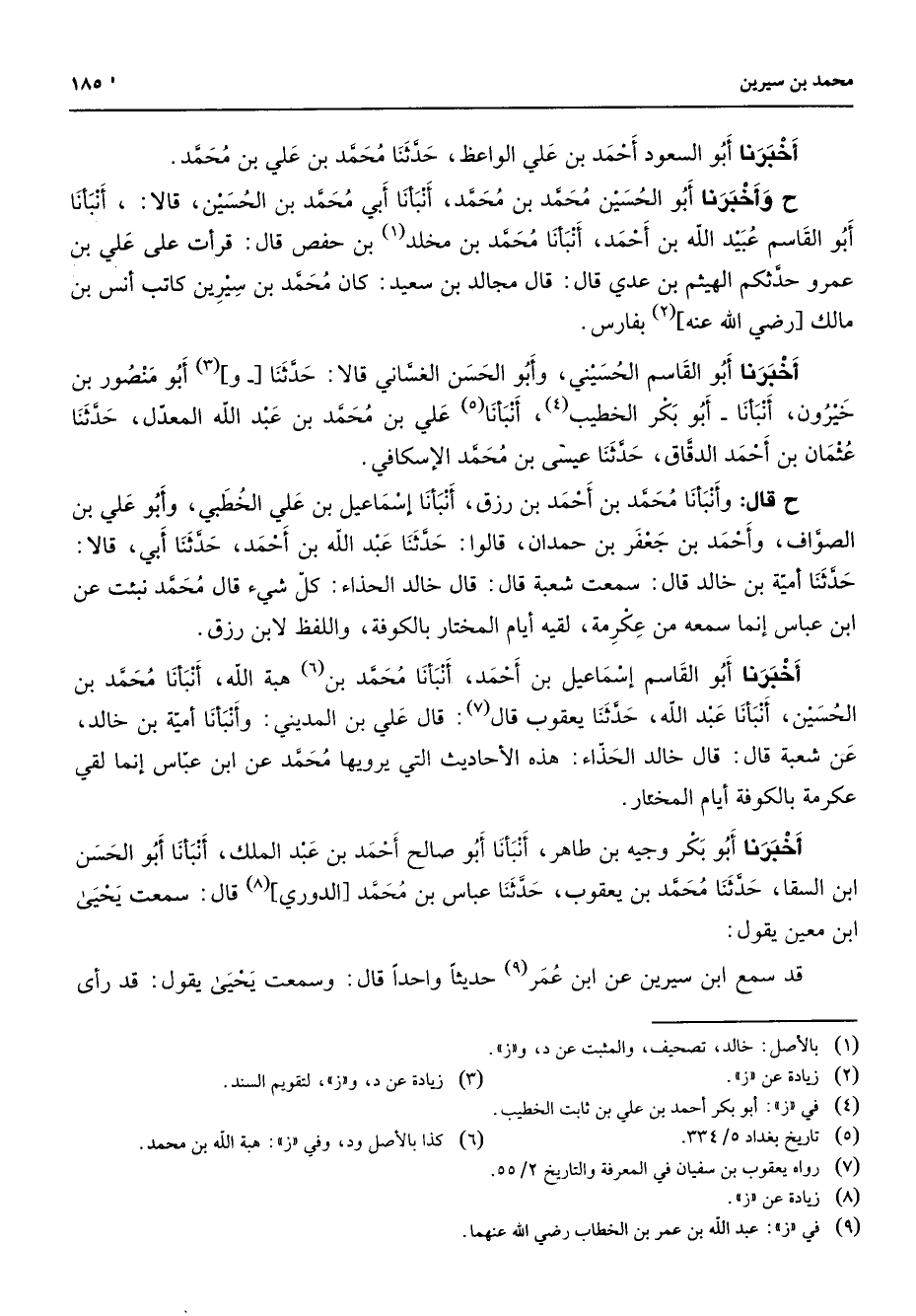 أخبرنا أبو السعود أحمد بن علي الواعظ حدثنا محمد بن علي بن محمد ح وأخبرنا أبو الحسين محمد بن محمد أنبأنا أبي محمد بن الحسين قالا أنبأنا أبو القاسم عبيد الله بن أحمد أنبأنا محمد بن مخلد (1) بن حفص قال قرأت على علي بن عمرو حدثكم الهيثم بن عدي قال قال مجالد بن سعيد كان محمد بن سيرين كاتب أنس بن مالك Bهـ (2) بفارس أخبرنا أبو القاسم الحسيني وأبو الحسن الغساني قالا حدثنا و (3) أبو منصور بن خيرون أنبأنا أبو بكر الخطيب (4) أنبأنا (5) علي بن محمد بن عبد الله المعدل حدثنا عثمان بن أحمد الدقاق حدثنا عيسى بن محمد الإسكافي ح قال وأنبأنا محمد بن أحمد بن رزق أنبأنا إسماعيل بن علي الخطبي وأبو علي بن الصواف وأحمد بن جعفر بن حمدان قالوا حدثنا عبد الله بن أحمد حدثنا أبي قالا حدثنا أمية بن خالد قال سمعت شعبة قال قال خالد الحذاء كل شئ قال محمد نبئت عن ابن عباس إنما سمعه من عكرمه لقيه أيام المختار بالكوفة واللفظ لابن رزق أخبرنا أبو القاسم إسماعيل بن أحمد أنبأنا محمد بن (6) هبة الله أنبأنا محمد بن الحسين أنبأنا عبد الله حدثنا يعقوب قال (7) قال علي بن المديني وأنبأنا أمية بن خالد عن شعبة قال قال خالد الحذاء هذه الأحاديث التي يرويها محمد عن ابن عباس إنما لقي عكرمة بالكوفة أيام المختار أخبرنا أبو بكر وجيه بن طاهر أنبأنا أبو صالح أحمد بن عبد الملك أنبأنا أبو الحسن أبن السقا حدثنا محمد بن يعقوب حدثنا عباس بن محمد الدوري (8) قال سمعت يحيى ابن معين يقول قد سمع ابن سيرين عن ابن عمر (9) حديثا واحدا قال وسمعت يحيى يقول قد رأى