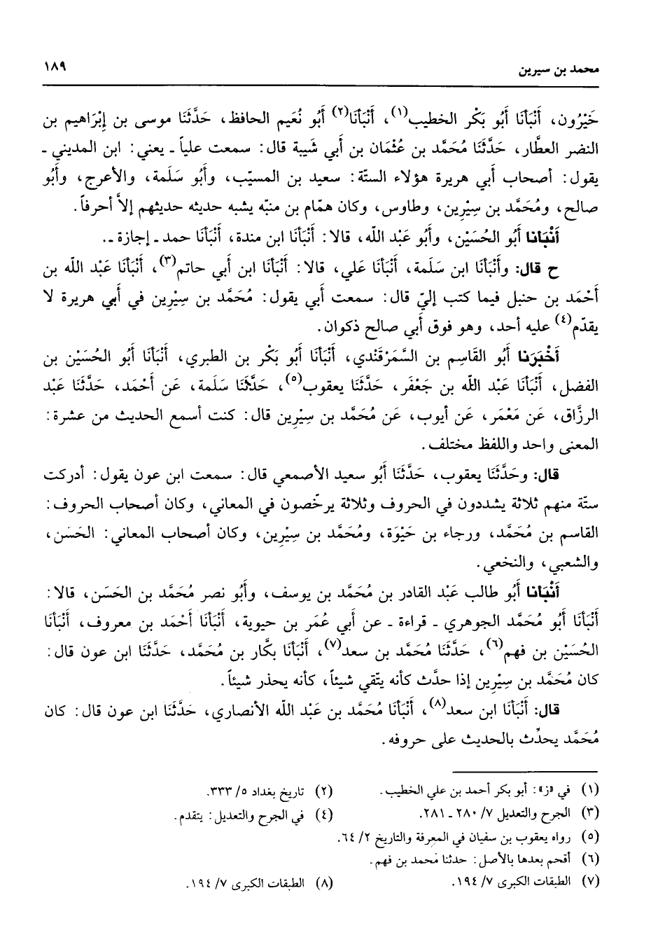 خيرون أنبأنا أبو بكر الخطيب (1) أنبأنا (2) أبو نعيم الحافظ حدثنا موسى بن إبراهيم بن النضر العطار حدثنا محمد بن عثمان بن أبي شيبة قال سمعت عليا يعني ابن المديني يقول أصحاب أبي هريرة هؤلاء الستة سعيد بن المسيب وأبو سلمة والأعراج وأبو صالح ومحمد بن سيرين وطاوس وكان همام بن منبه يشبه حديثه حديثهم إلا أحرفا أنبأنا أبو الحسين وأبو عبد الله قالا أنبأنا ابن مندة أنبأنا حمد إجازة ح قال وأنبأنا ابن سلمة أنبأنا علي قالا أنبأنا ابن أبي حاتم (3) أنبأنا عبد الله بن أحمد بن حنبل فيما كتب إلي قال سمعت أبي يقول محمد بن سيرين في أبي هريرة لا يقدم (4) عليه أحد وهو فوق أبي صالح ذكوان أخبرنا أبو القاسم بن السمرقندي أنبأنا أبو بكر بن الطبري أنبأنا أبو الحسين بن الفضل أنبأنا عبد الله بن جعفر حدثنا يعقوب (5) حدثنا سلمة عن أحمد حدثنا عبد الرزاق عن معمر عن أيوب عن محمد بن سيرين قال كنت أسمع الحديث من عشرة المعنى واحد واللفظ مختلف قال وحدثنا يعقوب حدثنا أبو سعيد الأصمعي قال سمعت ابن عون يقول أدركت ستة منهم ثلاثة يشددون في الحروف وثلاثة يرخصون في المعاني وكان أصحاب الحروف القاسم بن محمد ورجاء بن حيوة ومحمد بن سيرين وكان أصحاب المعاني الحسن والشعبي والنخعي أنبأنا أبو طالب عبد القادر بن محمد بن يوسف وأبو نصر محمد بن الحسن قالا أنبأنا أبو محمد الجوهري قراءة عن أبي عمر بن حيوية أنبأنا أحمد بن معروف أنبأنا الحسين بن فهم (6) حدثنا محمد بن سعد (7) أنبأنا بكار بن محمد حدثنا ابن عون قال كان محمد بن سيرين إذا حدث كأنه يتقي شيئا كأنه يحذر شيئا قال أنبأنا ابن سعد (8) أنبأنا محمد بن عبد الله الأنصاري حدثنا ابن عون قال كان محمد يحدث بالحديث على حروفه