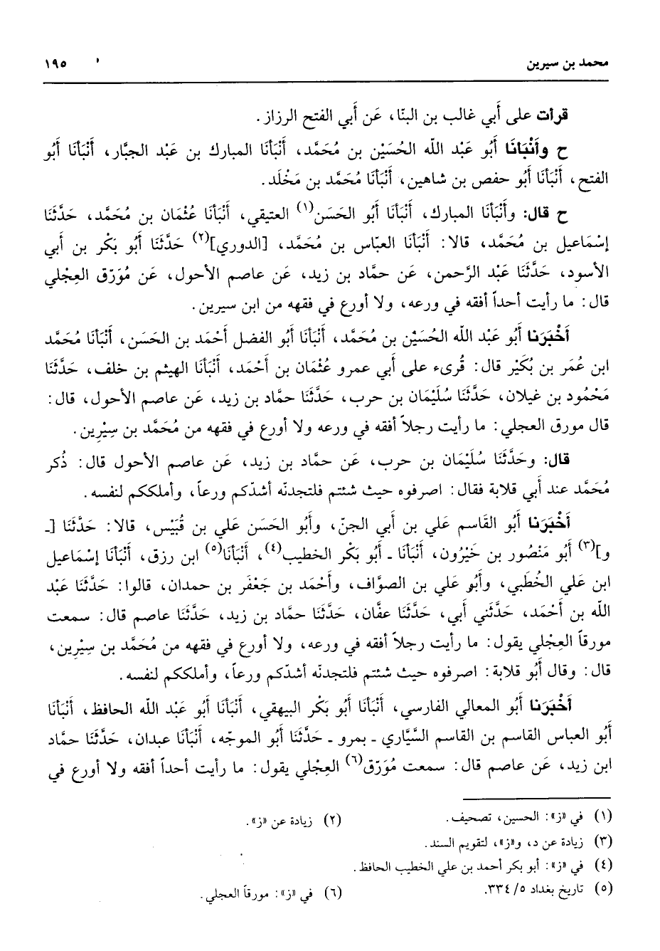 قرأت على أبي غالب بن البنا عن أبي الفتح الرزاز ح وأنبأنا أبو عبد الله الحسين بن محمد أنبأنا المبارك بن عبد الجبار أنبأنا أبو الفتح أنبأنا أبو حفص بن شاهين أنبأنا محمد بن مخلد ح قال وأنبأنا المبارك أنبأنا أبو الحسن (1) العتيقي أنبأنا عثمان بن محمد حدثنا إسماعيل بن محمد قالا أنبأنا العباس بن محمد الدوري (2) حدثنا أبو بكر بن أبي الأسود حدثنا عبد الرحمن عن حماد بن زيد عن عاصم الأحول عن مورق العجلي قال ما رأيت أحدا أفقه في ورعه ولا أورع في فقهه من ابن سيرين أخبرنا أبو عبد الله الحسين بن محمد أنبأنا أبو الفضل أحمد بن الحسن أنبأنا محمد ابن عمر بن بكير قال قرئ على أبي عمرو عثمان بن أحمد أنبأنا الهيثم بن خلف حدثنا محمود بن غيلان حدثنا سليمان بن حرب حدثنا حماد بن زيد عن عاصم الأحول قال قال مورق العجلي ما رأيت رجلا أفقه في ورعه ولا أورع في فقهه من محمد بن سيرين قال وحدثنا سليمان بن حرب عن حماد بن زيد عن عاصم الأحول قال ذكر محمد عند أبي قلابة فقال اصرفوه حيث شئتم فلتجدنه أشدكم ورعا وأملككم لنفسه أخبرنا أبو القاسم علي بن أبي الجن وأبو الحسن علي بن قبيس قالا حدثنا وأ (3) بو منصور بن خيرون أنبأنا أبو بكر الخطيب (4) أنبأنا (5) ابن رزق أنبأنا إسماعيل ابن علي الخطبي وأبو علي بن الصواف وأحمد بن جعفر بن حمدان قالوا حدثنا عبد الله بن أحمد حدثني أبي حدثنا عفان حدثنا حماد بن زيد حدثنا عاصم قال سمعت مورقا العجلي يقول ما رأيت رجلا أفقه في ورعه ولا أورع في فقهه من محمد بن سيرين قال وقال أبو قلابة اصرفوه حيث شئتم فلتجدنه أشدكم ورعا وأملككم لنفسه أخبرنا أبو المعالي الفارسي أنبأنا أبو بكر البيهقي أنبأنا أبو عبد الله الحافظ أنبأنا أبو العباس القاسم بن القاسم السياري بمرو حدثنا أبو الموجه أنبأنا عبدان حدثنا حماد ابن زيد عن عاصم قال سمعت مورق (6) العجلي يقول ما رأيت أحدا أفقه ولا أورع في