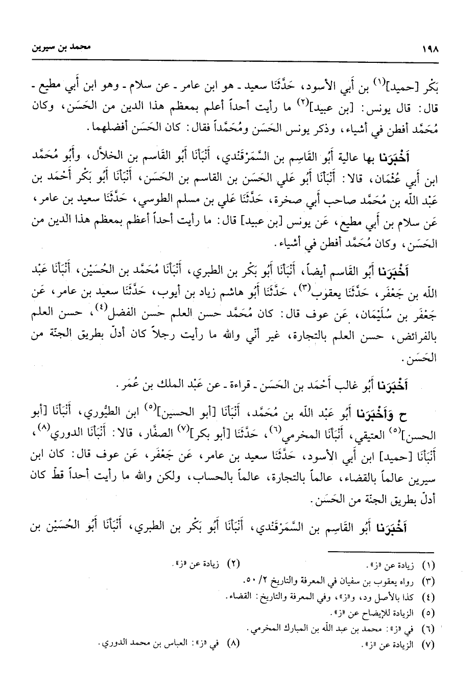 بكر حميد (1) بن أبي الأسود حدثنا سعيد هو ابن عامر عن سلام وهو ابن أبي مطيع قال قال يونس بن عبيد (2) ما رأيت أحدا أعلم بمعظم هذا الدين من الحسن وكان محمد أفطن في أشياء وذكر يونس الحسن ومحمدا فقال كان الحسن أفضلهما أخبرنا بها عالية أبو القاسم بن السمرقندي أنبأنا أبو القاسم بن الخلال وأبو محمد ابن أبي عثمان قالا أنبأنا أبو علي الحسن بن القاسم بن الحسن أنبأنا أبو بكر أحمد بن عبد الله بن محمد صاحب أبي صخرة حدثنا علي بن مسلم الطوسي حدثنا سعيد بن عامر عن سلام بن أبي مطيع عن يونس بن عبيد قال ما رأيت أحدا أعظم بمعظم هذا الدين من الحسن وكان محمد أفطن في أشياء أخبرنا أبو القاسم أيضا أنبأنا أبو بكر بن الطبري أنبأنا محمد بن الحسين أنبأنا عبد الله بن جعفر حدثنا يعقوب (3) حدثنا أبو هاشم زياد بن أيوب حدثنا سعيد بن عامر عن جعفر بن سليمان عن عوف قال كان محمد حسن العلم حسن الفضل (4) حسن العلم بالفرائض حسن العلم بالتجارة غير أني والله ما رأيت رجلا كان أدل بطريق الجنة من الحسن أخبرنا أبو غالب أحمد بن الحسن قراءة عن عبد الملك بن عمر ح وأخبرنا أبو عبد الله بن محمد أنبأنا أبو الحسين (5) ابن الطيوري أنبأنا أبو الحسن العتيقي أنبأنا المخرمي (6) حدثنا أبو بكر (7) الصفار قالا أنبأنا الدوري (8) أنبأنا حميد ابن أبي الأسود حدثنا سعيد بن عامر عن جعفر عن عوف قال كان ابن سيرين عالما بالقضاء عالما بالتجارة عالما بالحساب ولكن والله ما رأيت أحدا قط كان أدل بطريق الجنة من الحسن أخبرنا أبو القاسم بن السمرقندي أنبأنا أبو بكر بن الطبري أنبأنا أبو الحسين بن