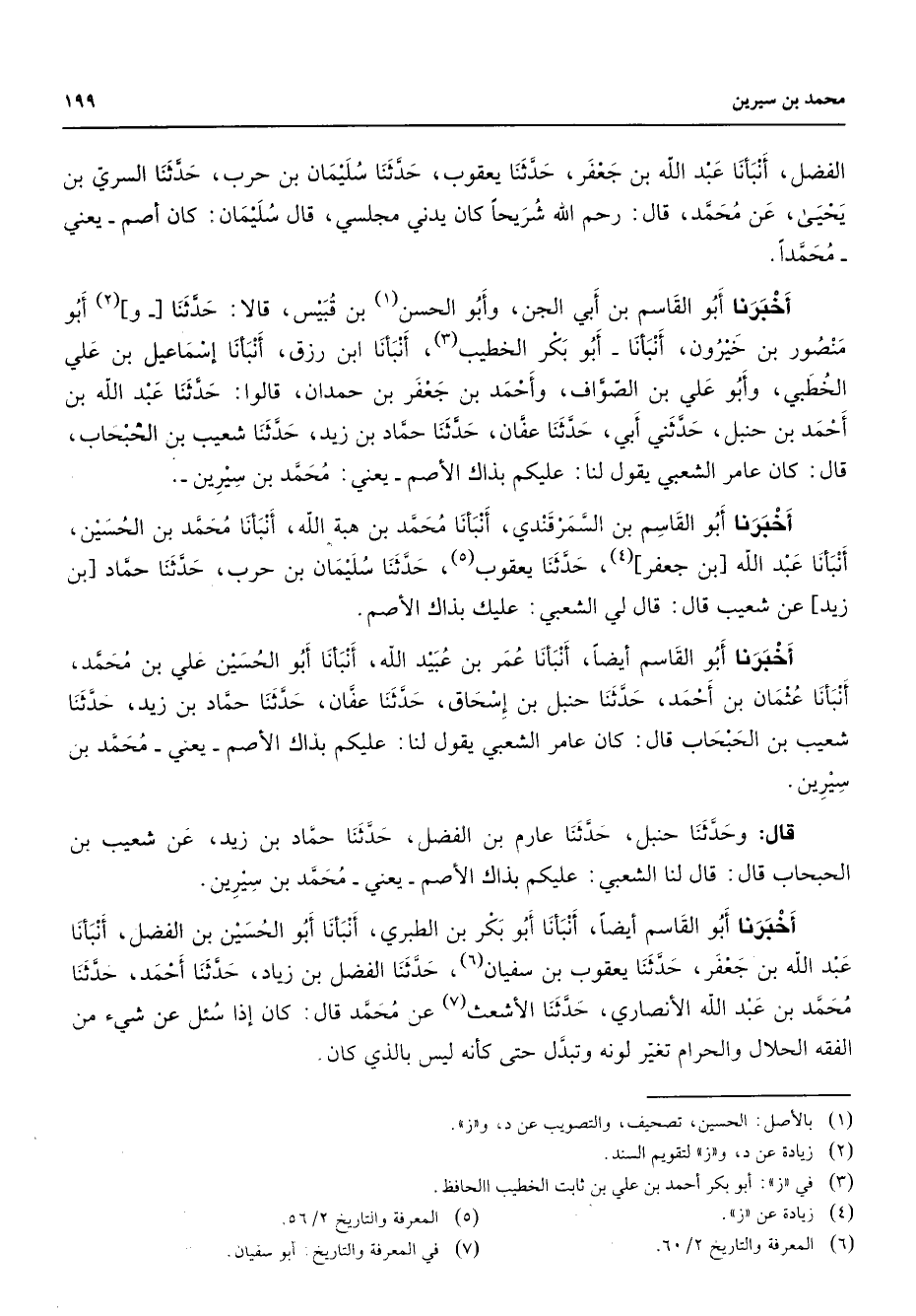 الفضل أنبأنا عبد الله بن جعفر حدثنا يعقوب حدثنا سليمان بن حرب حدثنا السري بن يحيى عن محمد قال رحم الله شريحا كان يدني مجلسي قال سليمان كان أصم يعني محمدا أخبرنا أبو القاسم بن أبي الجن وأبو الحسن (1) بن قبيس قالا حدثنا و (2) أبو منصور بن خيرون أنبأنا أبو بكر الخطيب (3) أنبأنا ابن رزق أنبأنا إسماعيل بن علي الخطبي وأبو علي بن الصواف وأحمد بن جعفر بن حمدان قالوا حدثنا عبد الله بن أحمد بن حنبل حدثني أبي حدثنا عفان حدثنا حماد بن زيد حدثنا شعيب بن الحبحاب قال كان عامر الشعبي يقول لنا عليكم بذاك الأصم يعني محمد بن سيرين أخبرنا أبو القاسم بن السمرقندي أنبأنا محمد بن هبة الله أنبأنا محمد بن الحسين أنبأنا عبد الله بن جعفر (4) حدثنا يعقوب (5) حدثنا سليمان بن حرب حدثنا حماد بن زيد عن شعيب قال قال لي الشعبي عليك بذاك الأصم أخبرنا أبو القاسم أيضا أنبأنا عمر بن عبيد الله أنبأنا أبو الحسين علي بن محمد أنبأنا عثمان بن أحمد حدثنا حنبل بن إسحاق حدثنا عفان حدثنا حماد بن زيد حدثنا شعيب بن الحبحاب قال كان عامر الشعبي يقول لنا عليكم بذاك الأصم يعني محمد بن سيرين قال وحدثنا حنبل حدثنا عارم بن الفضل حدثنا حماد بن زيد عن شعيب بن الحبحاب قال قال لنا الشعبي عليكم بذاك الأصم يعني محمد بن سيرين أخبرنا أبو القاسم أيضا أنبأنا أبو بكر بن الطبري أنبأنا أبو الحسين بن الفضل أنبأنا عبد الله بن جعفر حدثنا يعقوب بن سفيان (6) حدثنا الفضل بن زياد حدثنا أحمد حدثنا محمد بن عبد الله الأنصاري حدثنا الأشعث (7) عن محمد قال كان إذا سئل عن شئ من الفقه الحلال والحرام تغير لونه وتبدل حتى كأنه ليس بالذي كان