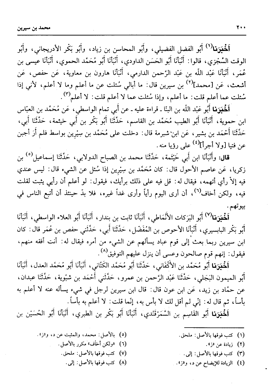 أخبرنا (1) أبو الفضل الفضيلي وأبو المحاسن بن زياد وأبو بكر الأدريجاني وأبو الوقت السجزي قالوا أنبأنا أبو الحسن الداودي أنبأنا أبو محمد الحموي أنبأنا عيسى بن عمر أنبأنا عبد الله بن عبد الرحمن الدارمي أنبأنا هارون بن معاوية عن حفص عن أشعث عن محمد (2) بن سيرين قال ما أبالي سئلت عن ما أعلم وما لا أعلم لأني إذا سئلت عما أعلم قلت ما أعلم وإذا سئلت عما لا أعلم قلت لا أعلم (3) أخبرنا أبو عبد الله بن البنا قراءة عليه عن أبي تمام الواسطي عن محمد بن العباس ابن حموية أنبأنا أبو الطيب محمد بن القاسم حدثنا أبو بكر بن أبي خيثمة حدثنا أبي حدثنا أحمد بن بشير عن ابن شبرمة قال دخلت على محمد بن سيرين بواسط فلم أر أجبن عن فتيا ولا أجرأ (4) على رؤيا منه قال وأنبأنا ابن أبي خيثمة حدثنا محمد بن الصباح الدولابي حدثنا إسماعيل (5) بن زكريا عن عاصم الأحول قال كان محمد بن سيرين إذا سئل عن الشئ قال ليس عندي فيه إلا رأي أتهمه فيقال له قل فيه على ذلك برأيك فيقول لو أعلم أن رأيي يثبت لقلت فيه ولكن أخاف (6) أن أرى اليوم رأيا وأرى غدا غيره فلا بد حينئذ أن أتبع الناس في بيوتهم أخبرنا (7) أبو البركات الأنماطي أنبأنا ثابت بن بندار أنبأنا أبو العلاء الواسطي أنبأنا أبو بكر البابسيري أنبأنا الأحوص بن المفضل حدثنا أبي حدثني حفص بن عمر قال كان ابن سيرين ربما بعث إلى قوم عباد يسألهم عن الشئ من أمره فيقال له أنت أفقه منهم فيقول إنهم قوم صالحون وعسى أن ينزل عليهم التوفيق (8) أخبرنا أبو محمد بن الأكفاني حدثنا أبو محمد الكتاني أنبأنا أبو محمد العدل أنبأنا أبو الميمون البجلي حدثنا عبد الرحمن بن عمرو حدثني أحمد بن شبوية حدثنا عبدان عن حماد بن زيد عن ابن عون قال قال ابن سيرين لرجل في شئ يسأله عنه لا أعلم به بأسا ثم قال له إني لم أقل لك لا بأس به إنما قلت لا أعلم به بأسا أخبرنا أبو القاسم بن السمرقندي أنبأنا أبو بكر بن الطبري أنبأنا أبو الحسين بن