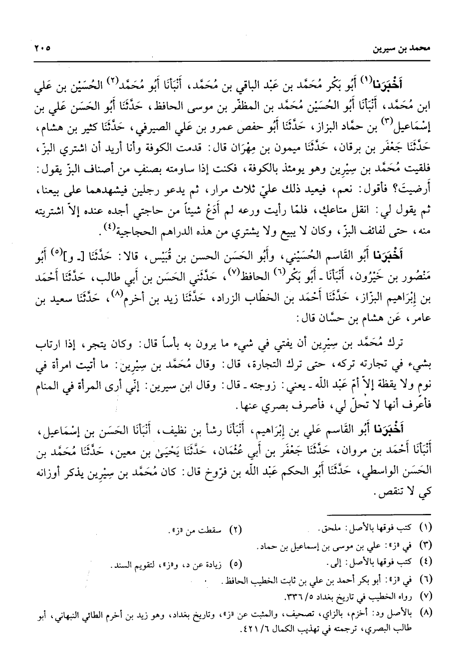 أخبرنا (1) أبو بكر محمد بن عبد الباقي بن محمد أنبأنا أبو محمد (2) الحسين بن علي ابن محمد أنبأنا أبو الحسين محمد بن المظفر بن موسى الحافظ حدثنا أبو الحسن علي بن إسماعيل (3) بن حماد البزاز حدثنا أبو حفص عمرو بن علي الصيرفي حدثنا كثير بن هشام حدثنا جعفر بن برقان حدثنا ميمون بن مهران قال قدمت الكوفة وأنا أريد أن أشتري البز فلقيت محمد بن سيرين وهو يومئذ بالكوفة فكنت إذا ساومته بصنف من أصناف البز يقول أرضيت فأقول نعم فيعيد ذلك علي ثلاث مرار ثم يدعو رجلين فيشهدهما على بيعنا ثم يقول لي انقل متاعك فلما رأيت ورعه لم أدع شيئا من حاجتي أجده عنده إلا اشتريته منه حتى لفائف البز وكان لا يبيع ولا يشتري من هذه الدراهم الحجاجية (4) أخبرنا أبو القاسم الحسيني وأبو الحسن الحسن بن قبيس قالا حدثنا و (5) أبو منصور بن خيرون أنبأنا أبو بكر (6) الحافظ (7) حدثني الحسن بن أبي طالب حدثنا أحمد بن إبراهيم البزاز حدثنا أحمد بن الخطاب الزراد حدثنا زيد بن أخرم (8) حدثنا سعيد بن عامر عن هشام بن حسان قال ترك محمد بن سيرين أن يفتي في شئ ما يرون به بأسا قال وكان يتجر إذا ارتاب بشئ في تجارته تركه حتى ترك التجارة قال وقال محمد بن سيرين ما أتيت امرأة في نوم ولا يقظة إلا أم عبد الله يعني زوجته قال وقال ابن سيرين إني أرى المرأة في المنام فأعرف أنها لا تحل لي فأصرف بصري عنها أخبرنا أبو القاسم علي بن إبراهيم أنبأنا رشأ بن نظيف أنبأنا الحسن بن إسماعيل أنبأنا أحمد بن مروان حدثنا جعفر بن أبي عثمان حدثنا يحيى بن معين حدثنا محمد بن الحسن الواسطي حدثنا أبو الحكم عبد الله بن فروخ قال كان محمد بن سيرين يذكر أوزانه كي لا تنقص * (امش كي لا تنقص