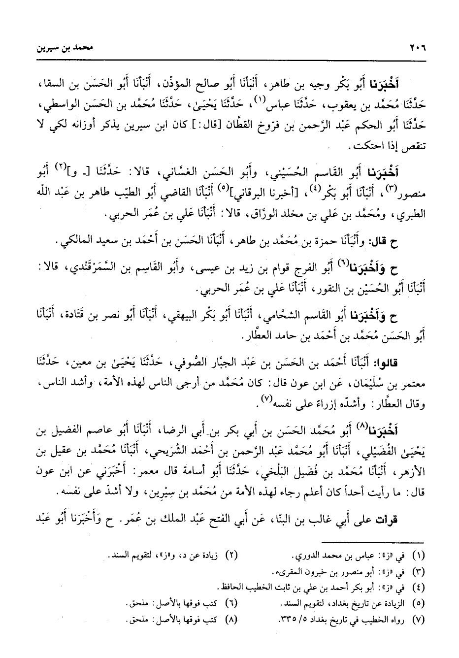 أخبرنا أبو بكر وجيه بن طاهر أنبأنا أبو صالح المؤذن أنبأنا أبو الحسن بن السقا حدثنا محمد بن يعقوب حدثنا عباس (1) حدثنا يحيى حدثنا محمد بن الحسن الواسطي حدثنا أبو الحكم عبد الرحمن بن فروخ القطان قال كان ابن سرين يذكر أوزانه لكي لا تنقص إذا احتكت أخبرنا أبو القاسم الحسيني وأبو الحسن الغساني قالا حدثنا و (2) أبو منصور (3) أنبأنا أبو بكر (4) أخبرنا البرقاني (5) أنبأنا القاضي أبو الطيب طاهر بن عبد الله الطبري ومحمد بن علي بن مخلد الوراق قالا أنبأنا علي بن عمر الحربي ح قال وأنبأنا حمزة بن محمد بن طاهر أنبأنا الحسن بن أحمد بن سعيد المالكي ح وأخبرنا (6) أبو الفرج قوام بن زيد بن عيسى وأبو القاسم بن السمرقندي قالا أنبأنا أبو الحسين بن النقور أنبأنا علي بن عمر الحربي ح وأخبرنا أبو القاسم الشحامي أنبأنا أبو بكر البيهقي أنبأنا أبو نصر بن قتادة أنبأنا أبو الحسن محمد بن أحمد بن حامد العطار قالوا أنبأنا أحمد بن الحسن بن عبد الجبار الصوفي حدثنا يحيى بن معين حدثنا معتمر بن سليمان عن ابن عون قال كان محمد من أرجى الناس لهذه الأمة وأشد الناس وقال العطار وأشده إزراء على نفسه (7) (8) أخبرنا أبو محمد الحسن بن أبي بكر بن أبي الرضا أنبأنا أبو عاصم الفضيل بن يحيى الفضيلي أنبأنا أبو محمد عبد الرحمن بن أحمد الشريحي أنبأنا محمد بن عقيل بن الأزهر أنبأنا محمد بن فضيل البلخي حدثنا أبو أسامة قال معمر أخبرني عن ابن عون قال ما رأيت أحدا كان أعلم رجاء لهذه الأمة من محمد بن سيرين ولا أشد على نفسه قرأت على أبي غالب بن البنا عن أبي الفتح عبد الملك بن عمر وأخبرنا أبو عبد