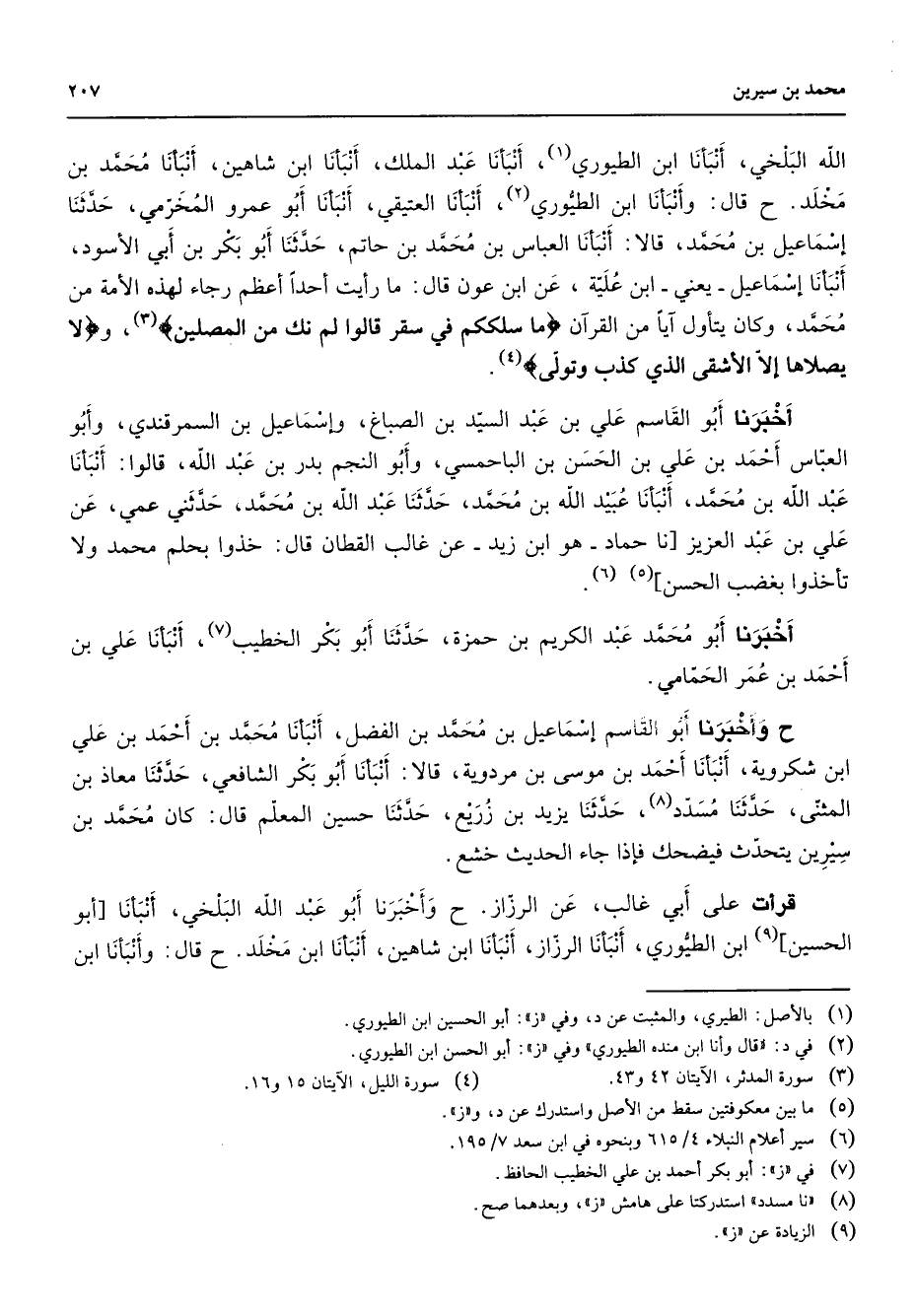الله البلخي أنبأنا ابن الطيوري (1) أنبأنا عبد الملك أنبأنا ابن شاهين أنبأنا محمد بن مخلد قال وأنبأنا ابن الطيوري (2) أنبأنا العتيقي أنبأنا أبو عمرو المخرمي حدثنا إسماعيل بن محمد قالا أنبأنا العباس بن محمد بن حاتم حدثنا أبو بكر بن أبي الأسود أنبأنا إسماعيل يعني ابن علية عن ابن عون قال ما رأيت أحدا أعظم رجاء لهذه الأمة من محمد وكان يتأول آيا من القرآن " ما سلككم في سقر قالوا لم نك من المصلين " و " (3) لا يصلاها إلا الأشقى الذي كذب وتولى (4) " أخبرنا أبو القاسم علي بن عبد السيد بن الصباغ وإسماعيل بن السمرقندي وأبو العباس أحمد بن علي بن الحسن بن الباحمسي وأبو النجم بدر بن عبد الله قالوا أنبأنا عبد الله بن محمد أنبأنا عبيد الله بن محمد حدثنا عبد الله بن محمد حدثني عمي عن علي بن عبد العزيز نا حماد هو ابن زيد عن غالب القطان قال خذوا بحلم محمد ولا تأخذوا بغضب الحسن (5) (6) أخبرنا أبو محمد عبد الكريم بن حمزة حدثنا أبو بكر الخطيب (7) أنبأنا علي بن أحمد بن عمر الحمامي ح وأخبرنا أبو القاسم إسماعيل بن محمد بن الفضل أنبأنا محمد بن أحمد بن علي ابن شكروية أنبأنا أحمد بن موسى بن مردوية قالا أنبأنا أبو بكر الشافعي حدثنا معاذ بن المثنى حدثنا مسدد (8) حدثنا يزيد بن زريع حدثنا حسين المعلم قال كان محمد بن سيرين يتحدث فيضحك فإذا جاء الحديث خشع قرأت على أبي غالب عن الرزاز وأخبرنا أبو عبد الله البلخي أنبأنا أبو الحسين (9) ابن الطيوري أنبأنا الرزاز أنبأنا ابن شاهين أنبأنا ابن