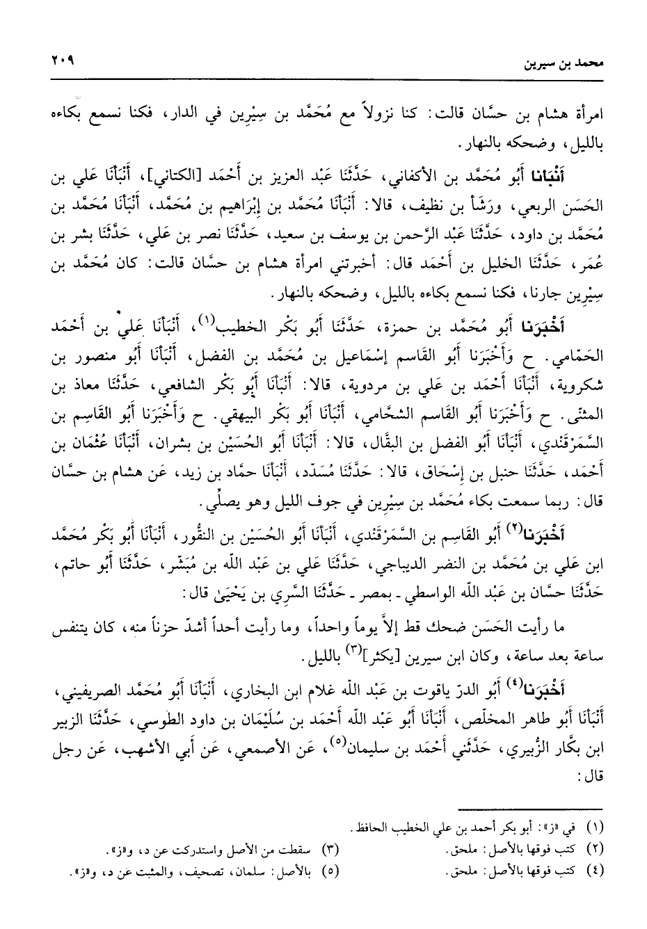 امرأة هشام بن حسان قالت كنا نزولا مع محمد بن سيرين في الدار فكنا نسمع بكاءه بالليل وضحكه بالنهار أنبأنا أبو محمد بن الأكفاني حدثنا عبد العزيز بن أحمد الكتاني أنبأنا علي بن الحسن الربعي ورشأ بن نظيف قالا أنبأنا محمد بن إبراهيم بن محمد أنبأنا محمد بن محمد بن داود حدثنا عبد الرحمن بن يوسف بن سعيد حدثنا نصر بن علي حدثنا بشر بن عمر حدثنا الخليل بن أحمد قال أخبرتني امرأة هشام بن حسان قالت كان محمد بن سيرين جارنا فكنا نسمع بكاءه بالليل وضحكه بالنهار أخبرنا أبو محمد بن حمزة حدثنا أبو بكر الخطيب (1) أنبأنا علي بن أحمد الحمامي وأخبرنا أبو القاسم إسماعيل بن محمد بن الفضل أنبأنا أبو منصور بن شكروية أنبأنا أحمد بن علي بن مردوية قالا أنبأنا أبو بكر الشافعي حدثنا معاذ بن المثنى وأخبرنا أبو القاسم الشحامي أنبأنا أبو بكر البيهقي وأخبرنا أبو القاسم بن السمرقندي أنبأنا أبو الفضل بن البقال قالا أنبأنا أبو الحسين بن بشران أنبأنا عثمان بن أحمد حدثنا حنبل بن إسحاق قالا حدثنا مسدد أنبأنا حماد بن زيد عن هشام بن حسان قال ربما سمعت بكاء محمد بن سيرين في جوف الليل وهو يصلي أخبرنا (2) أبو القاسم بن السمرقندي أنبأنا أبو الحسين بن النقور أنبأنا أبو بكر محمد بن علي بن محمد بن النضر الديباجي حدثنا علي بن عبد الله بن مبشر حدثنا أبو حاتم حدثنا حسان بن عبد الله الواسطي بمصر حدثنا السري بن يحيى قال ما رأيت الحسن ضحك قط إلا يوما واحدا وما رأيت أحدا أشد حزنا منه كان يتنفس ساعة بعد ساعة وكان ابن سيرين يكثر (3) بالليل أخبرنا (4) أبو الدر ياقوت بن عبد الله غلام ابن البخاري أنبأنا أبو محمد الصريفيني أنبأنا أبو طاهر المخلص أنبأنا أبو عبد الله أحمد بن سليمان (5) بن داود الطوسي حدثنا الزبير ابن بكار الزبيري حدثني أحمد بن سليمان عن الأصمعي عن أبي الأشهب عن رجل قال