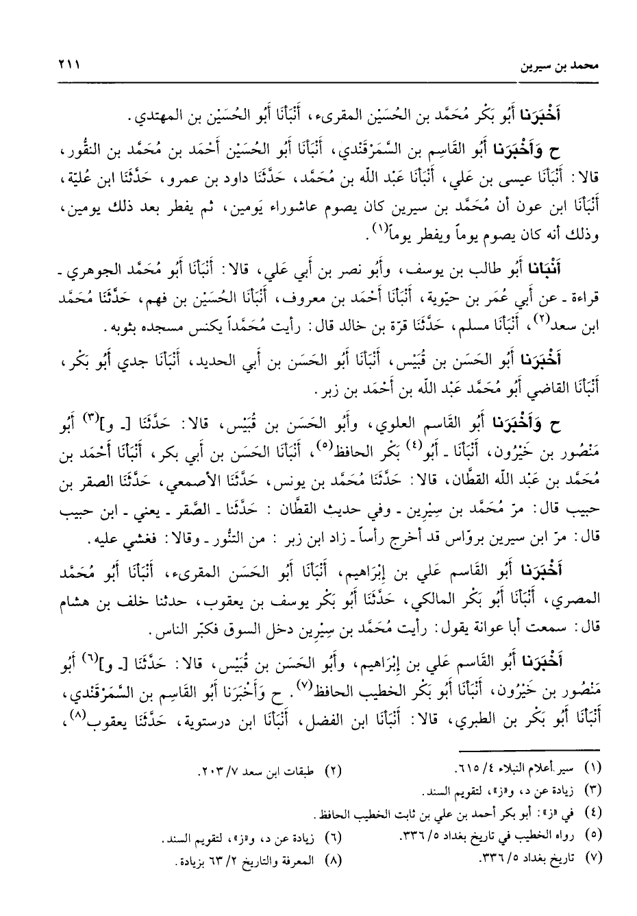 أخبرنا أبو بكر محمد بن الحسين المقرئ أنبأنا أبو الحسين بن المهتدي ح وأخبرنا أبو القاسم بن السمرقندي أنبأنا أبو الحسين أحمد بن محمد بن النقور قالا أنبأنا عيسى بن علي أنبأنا عبد الله بن محمد حدثنا داود بن عمرو حدثنا ابن علية أنبأنا ابن عون أن محمد بن سيرين كان يصوم عاشوراء يومين ثم يفطر بعد ذلك يومين وذلك أنه كان يصوم يوما ويفطر يوما (1) أنبأنا أبو طالب بن يوسف وأبو نصر بن أبي علي قالا أنبأنا أبو محمد الجوهري قراءة عن أبي عمر بن حيوية أنبأنا أحمد بن معروف أنبأنا الحسين بن فهم حدثنا محمد ابن سعد (2) أنبأنا مسلم حدثنا قرة بن خالد قال رأيت محمدا يكنس مسجده بثوبه أخبرنا أبو الحسن بن قبيس أنبأنا أبو الحسن بن أبي الحديد أنبأنا جدي أبو بكر أنبأنا القاضي أبو محمد عبد الله بن أحمد بن زبر ح وأخبرنا أبو القاسم العلوي وأبو الحسن بن قبيس قالا حدثنا وأبو (3) منصور بن خيرون أنبأنا أبو (4) بكر الحافظ (5) أنبأنا الحسن بن أبي بكر أنبأنا أحمد بن محمد بن عبد الله القطان قالا حدثنا محمد بن يونس حدثنا الأصمعي حدثنا الصقر بن حبيب قال مر محمد بن سيرين وفي حديث القطان حدثنا الصقر يعني ابن حبيب قال مر ابن سيرين برواس قد أخرج رأسا زاد ابن زبر من التنور وقالا فغشي عليه أخبرنا أبو القاسم علي بن إبراهيم أنبأنا أبو الحسن المقرئ أنبأنا أبو محمد المصري أنبأنا أبو بكر المالكي حدثنا أبو بكر يوسف بن يعقوب حدثنا خلف بن هشام قال سمعت أبا عوانة يقول رأيت محمد بن سيرين دخل السوق فكبر الناس أخبرنا أبو القاسم علي بن إبراهيم وأبو الحسن بن قبيس قالا حدثنا و (6) أبو منصور بن خيرون أنبأنا أبو بكر الخطيب الحافظ