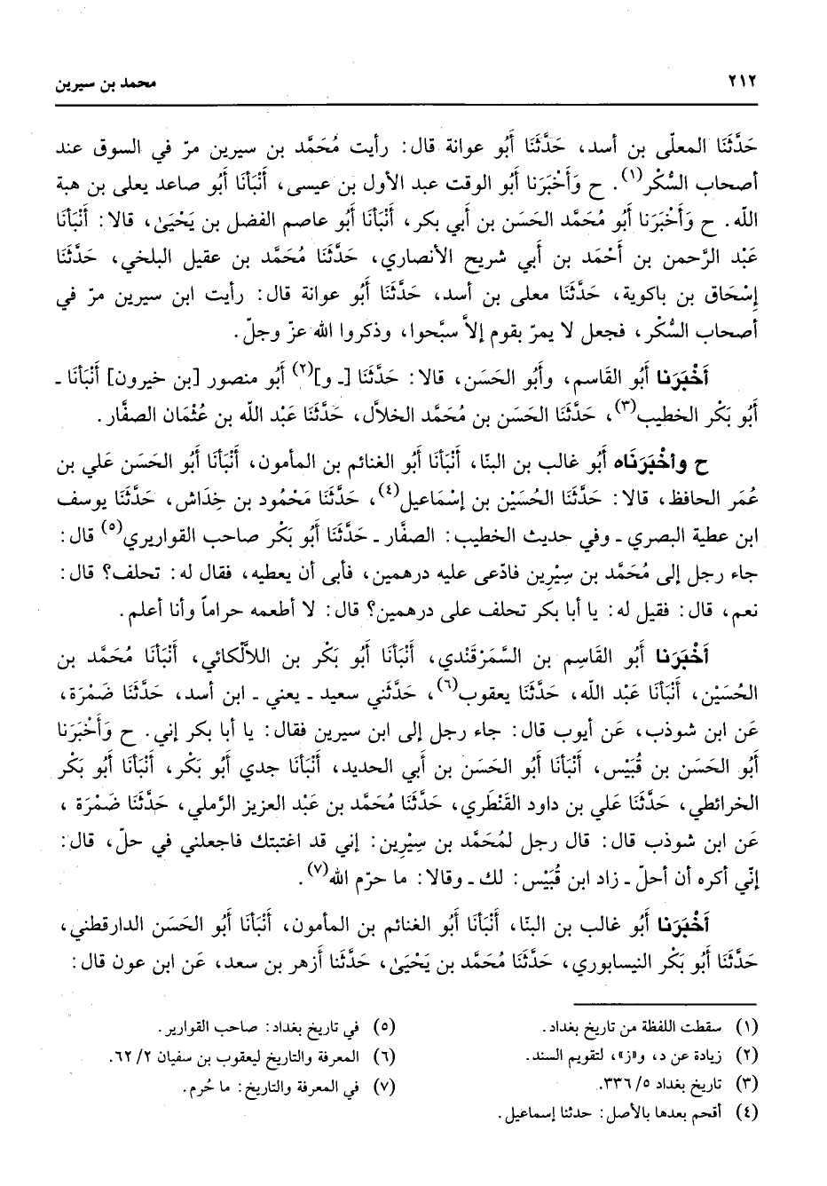 [1] وأخبرنا أبو الوقت عبد الأول بن عيسى أنبأنا أبو صاعد يعلى بن هبة الله وأخبرنا أبو محمد الحسن بن أبي بكر أنبأنا أبو عاصم الفضل بن يحيى قالا أنبأنا عبد الرحمن بن أحمد بن أبي شريح الأنصاري حدثنا محمد بن عقيل البلخي حدثنا إسحاق بن باكوية حدثنا معلى بن أسد حدثنا أبو عوانة قال رأيت ابن سيرين مر في أصحاب السكر أصحاب السكر فجعل لا يمر بقوم إلا سبحوا وذكروا الله عز وجل أخبرنا أبو القاسم وأبو الحسن قالا حدثنا (2) وأبو منصور بن خيرون أنبأنا أبو بكر الخطيب (3) حدثنا الحسن بن محمد الخلال حدثنا عبد الله بن عثمان الصفار ح وأخبرناه أبو غالب بن البنا أنبأنا أبو الغنائم بن المأمون أنبأنا أبو الحسن علي بن عمر الحافظ قالا حدثنا الحسين بن إسماعيل (4) حدثنا محمود بن خداش حدثنا يوسف ابن عطية البصري وفي حديث الخطيب الصفار حدثنا أبو بكر صاحب القواريري (5) قال جاء رجل إلى محمد بن سيرين فادعى عليه درهمين فأبى أن يعطيه فقال له تحلف قال نعم قال فقيل له يا أبا بكر تحلف على درهمين قال لا أطعمه حراما وأنا أعلم أخبرنا أبو القاسم بن السمرقندي أنبأنا أبو بكر بن اللالكائي أنبأنا محمد بن الحسين أنبأنا عبد الله حدثنا يعقوب (6) حدثني سعيد يعني ابن أسد حدثنا ضمرة عن ابن شوذب عن أيوب قال جاء رجل إلى ابن سيرين فقال يا أبا بكر إني وأخبرنا أبو الحسن بن قبيس أنبأنا أبو الحسن بن أبي الحديد أنبأنا جدي أبو بكر أنبأنا أبو بكر الخرائطي حدثنا علي بن داود القنطري حدثنا محمد بن عبد العزيز الرملي حدثنا ضمرة عن ابن شوذب قال قال رجل لمحمد بن سيرين إني قد اغتبتك فاجعلني في حل قال إني أكره أن أحل زاد ابن قبيس لك وقالا ما حرم الله (7) أخبرنا أبو غالب بن البنا أنبأنا أبو الغنائم بن المأمون أنبأنا أبو الحسن الدارقطني حدثنا أبو بكر النيسابوري حدثنا محمد بن يحيى حدثنا أزهر بن سعد عن ابن عون قال