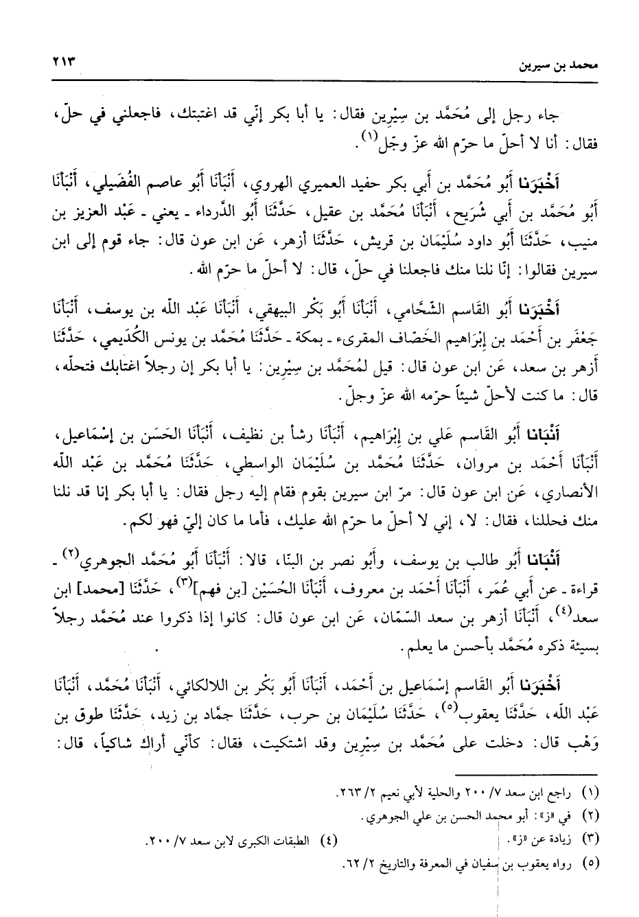 جاء رجل إلى محمد بن سيرين فقال يا أبا بكر إني قد اغتبتك فاجعلني في حل فقال أنا لا أحل ما حرم الله عز وجل (1) أخبرنا أبو محمد بن أبي بكر حفيد العميري الهروي أنبأنا أبو عاصم الفضيلي أنبأنا أبو محمد بن أبي شريح أنبأنا محمد بن عقيل حدثنا أبو الدرداء يعني عبد العزيز بن منيب حدثنا أبو داود سليمان بن قريش حدثنا أزهر عن ابن عون قال جاء قوم إلى ابن سيرين فقالوا إنا نلنا منك فاجعلنا في حل قال لا أحل ما حرم الله أخبرنا أبو القاسم الشحامي أنبأنا أبو بكر البيهقي أنبأنا عبد الله بن يوسف أنبأنا جعفر بن أحمد بن إبراهيم الخصاف المقرئ بمكة حدثنا محمد بن يونس الكديمي حدثنا أزهر بن سعد عن ابن عون قال قيل لمحمد بن سيرين يا أبا بكر إن رجلا اغتابك فتحله قال ما كنت لأحل شيئا حرمه الله عز وجل أنبأنا أبو القاسم علي بن إبراهيم أنبأنا رشأ بن نظيف أنبأنا الحسن بن إسماعيل أنبأنا أحمد بن مروان حدثنا محمد بن سليمان الواسطي حدثنا محمد بن عبد الله الأنصاري عن ابن عون قال مر ابن سيرين بقوم فقام إليه رجل فقال يا أبا بكر إنا قد نلنا منك فحللنا فقال لا إني لا أحل ما حرم الله عليك فأما ما كان إلي فهو لكم أنبأنا أبو طالب بن يوسف وأبو نصر بن البنا قالا أنبأنا أبو محمد الجوهري (2) قراءة عن أبي عمر أنبأنا أحمد بن معروف أنبأنا الحسين بن فهم (3) حدثنا محمد ابن سعد (4) أنبأنا أزهر بن سعد السمان عن ابن عون قال كانوا إذا ذكروا عند محمد رجلا بسيئة ذكره محمد بأحسن ما يعلم أخبرنا أبو القاسم إسماعيل بن أحمد أنبأنا أبو بكر بن اللالكائي أنبأنا محمد أنبأنا عبد الله حدثنا يعقوب (5) حدثنا سليمان بن حرب حدثنا جماد بن زيد حدثنا طوق بن وهب قال دخلت على محمد بن سيرين وقد اشتكيت فقال كأني أراك شاكيا قال