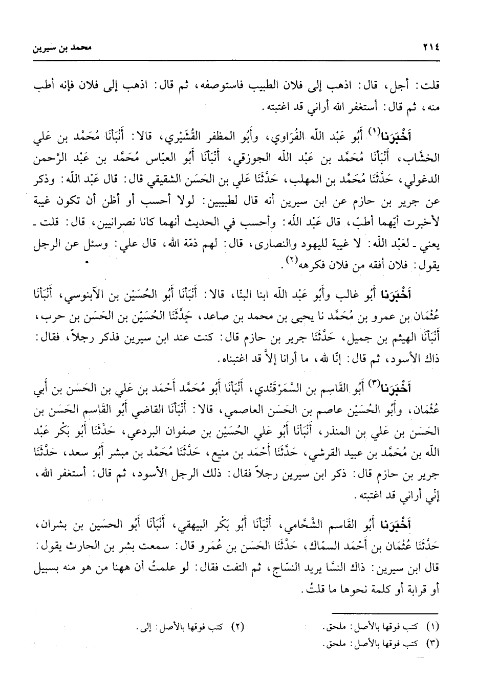 قلت أجل قال اذهب إلى فلان الطبيب فاستوصفه ثم قال اذهب إلى فلان فإنه أطب منه ثم قال أستغفر الله أراني قد اغتبته أخبرنا (1) أبو عبد الله الفراوي وأبو المظفر القشيري قالا أنبأنا محمد بن علي الخشاب أنبأنا محمد بن عبد الله الجوزقي أنبأنا أبو العباس محمد بن عبد الرحمن الدغولي حدثنا محمد بن المهلب حدثنا علي بن الحسن الشقيقي قال قال عبد الله وذكر عن جرير بن حازم عن ابن سيرين أنه قال لطبيبين لولا أحسب أو أطن أن تكون غيبة لأخبرت أيهما أطب قال عبد الله وأحسب في الحديث أنهما كانا نصرانيين قال قلت يعني لعبد الله لا غيبة لليهود والنصارى قال لهم ذمة الله قال علي وسئل عن الرجل يقول فلان أفقه من فلان فكرهه (2) أخبرنا أبو ب أخبرنا أبو غالب وأبو عبد الله ابنا البنا قالا أنبأنا أبو الحسين بن الآبنوسي أنبأنا عثمان بن عمرو بن محمد نا يحيى بن محمد بن صاعد حدثنا الحسين بن الحسن بن حرب أنبأنا الهيثم بن جميل حدثنا جرير بن حازم قال كنت عند ابن سيرين فذكر رجلا فقال ذاك الأسود ثم قال إنا لله ما أرانا إلا قد اغتبناه أخبرنا (3) أبو القاسم بن السمرقندي أنبأنا أبو محمد أحمد بن علي بن الحسن بن أبي عثمان وأبو الحسين عاصم بن الحسن العاصمي قالا أنبأنا القاضي أبو القاسم الحسن بن الحسن بن علي بن المنذر أنبأنا أبو علي الحسين بن صفوان البردعي حدثنا أبو بكر عبد الله بن محمد بن عبيد القرشي حدثنا أحمد بن منيع حدثنا محمد بن مبشر أبو سعد حدثنا جرير بن حازم قال ذكر ابن سيرين رجلا فقال ذلك الرجل الأسود ثم قال أستغفر الله إني أراني قد اغتبته أخبرنا أبو القاسم الشحامي أنبأنا أبو بكر البيهقي أنبأنا أبو الحسين بن بشران حدثنا عثمان بن أحمد السماك حدثنا الحسن بن عمرو قال سمعت بشر بن الحارث يقول قال ابن سيرين ذاك النسا يريد النساج ثم التفت فقال لو علمت أن ههنا من هو منه بسبيل أو قرابة أو كلمة نحوها ما قلت