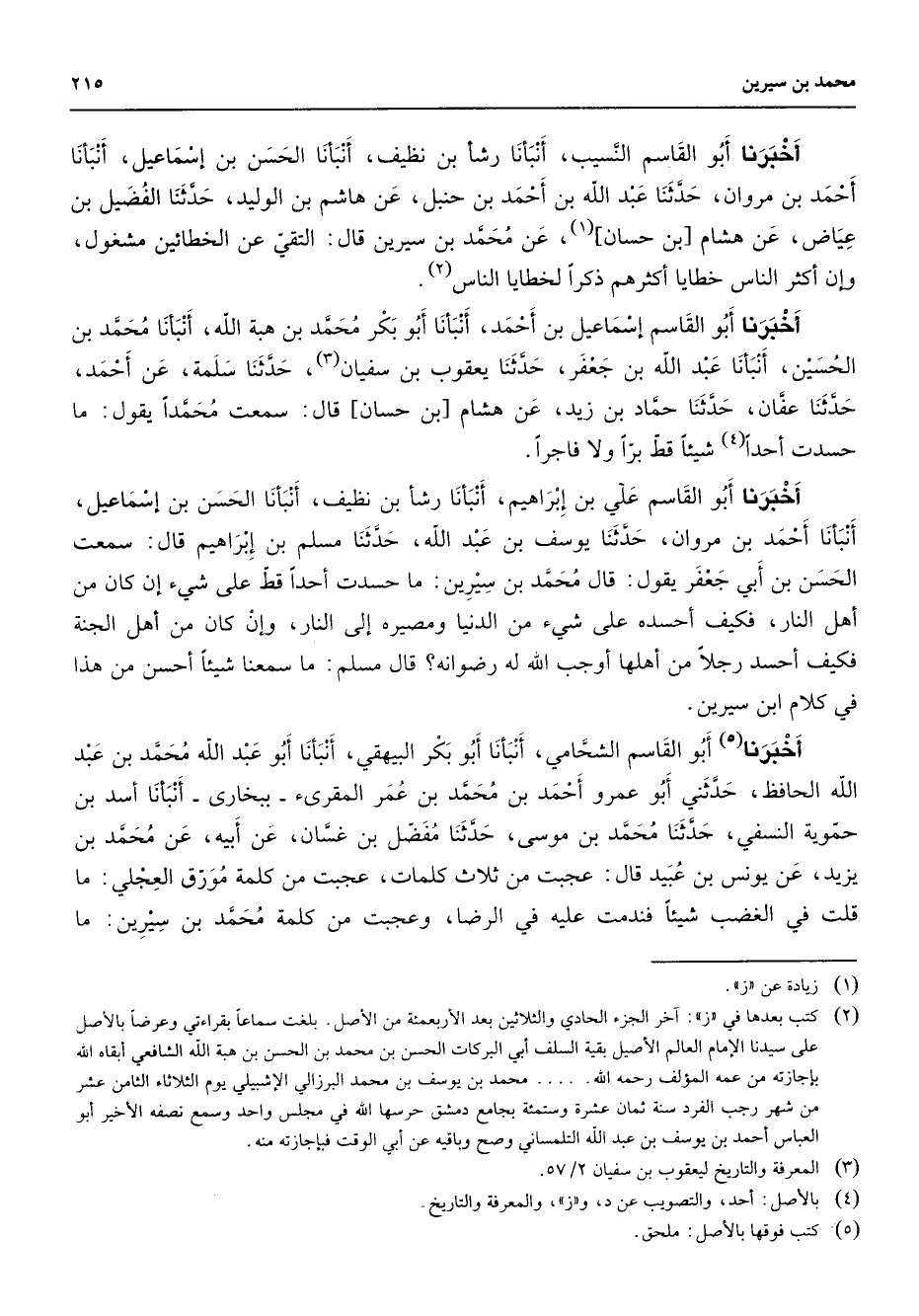 أخبرنا أبو القاسم النسيب أنبأنا رشأ بن نظيف أنبأنا الحسن بن إسماعيل أنبأنا أحمد بن مروان حدثنا عبد الله بن أحمد بن حنبل عن هاشم بن الوليد حدثنا الفضيل بن عياض عن هشام بن حسان (1) عن محمد بن سيرين قال التقي عن الخطائين مشغول وإن أكثر الناس خطايا أكثرهم ذكرا لخطايا الناس (2) أخبرنا أبو القاسم إسماعيل بن أحمد أنبأنا أبو بكر محمد بن هبة الله أنبأنا محمد بن الحسين أنبأنا عبد الله بن جعفر حدثنا يعقوب بن سفيان (3) حدثنا سلمة عن أحمد حدثنا عفان حدثنا حماد بن زيد عن هشام بن حسان قال سمعت محمدا يقول ما حسدت أحدا (4) شيئا قط برا ولا فاجرا أخبرنا أبو القاسم علي بن إبراهيم أنبأنا رشأ بن نظيف أنبأنا الحسن بن إسماعيل أنبأنا أحمد بن مروان حدثنا يوسف بن عبد الله حدثنا مسلم بن إبراهيم قال سمعت الحسن بن أبي جعفر يقول قال محمد بن سيرين ما حسدت أحدا قط على شئ إن كان من أهل النار فكيف أحسده على شئ من الدنيا ومصيره إلى النار وإن كان من أهل الجنة فكيف أحسد رجلا من أهلها أوجب الله له رضوانه قال مسلم ما سمعنا شيئا أحسن من هذا في كلام ابن سيرين أخبرنا (5) أبو القاسم الشحامي أنبأنا أبو بكر البيهقي أنبأنا أبو عبد الله محمد بن عبد الله الحافظ حدثني أبو عمرو أحمد بن محمد بن عمر المقرئ ببخارى أنبأنا أسد بن حموية النسفي حدثنا محمد بن موسى حدثنا مفضل بن غسان عن أبيه عن محمد بن يزيد عن يونس بن عبيد قال عجبت من ثلاث كلمات عجبت من كلمة مورق العجلي ما قلت في الغضب شيئا فندمت عليه في الرضا وعجبت من كلمة محمد بن سيرين ما