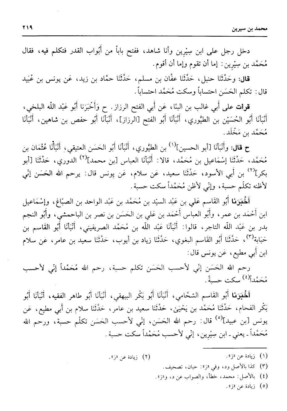 دخل رجل على ابن سيرين وأنا شاهد ففتح بابا من أبواب القدر فتكلم فيه فقال محمد بن سيرين إما أن تقوم وإما أن أقوم قال وحدثنا حنبل حدثنا عفان بن مسلم حدثنا حماد بن زيد عن يونس بن عبيد قال تكلم الحسن احتسابا وسكت محمد احتسابا قرأت على أبي غالب بن البنا عن أبي الفتح الرزاز وأخبرنا أبو عبد الله البلخي أنبأنا أبو الحسين بن الطيوري أنبأنا أبو الفتح الرزاز أنبأنا أبو حفص بن شاهين أنبأنا محمد بن مخلد ح قال وأنبأنا أبو الحسين (1) بن الطيوري أنبأنا أبو الحسن العتيقي أنبأنا عثمان بن محمد حدثنا إسماعيل بن محمد قالا أنبأنا العباس بن محمد (2) الدوري حدثنا أبو بكر بن أبي الأسود حدثنا سعيد عن سلام عن يونس قال يرحم الله الحسن إني لأظنه تكلم حسبة وإني لأظن محمدا سكت حسبة أخبرنا أبو القاسم علي بن عبد السيد بن محمد بن عبد الواحد بن الصباغ وإسماعيل ابن أحمد بن عمر وأبو العباس أحمد بن علي بن الحسن بن نصر بن الباحمشي وأبو النجم بدر بن عبد الله التاجر قالوا أنبأنا عبد الله بن محمد الصريفيني أنبأنا أبو القاسم بن حبابة (3) حدثنا أبو القاسم البغوي حدثنا زياد بن أيوب حدثنا سعيد بن عامر عن سلام ابن أبي مطيع عن يونس قال رحم الله الحسن إني لأحسب الحسن تكلم حسبة رحم الله محمدا إني لأحسب محمدا (4) سكت حسبة أخبرنا أبو القاسم الشحامي أنبأنا أبو بكر البيهقي أنبأنا أبو طاهر الفقيه أنبأنا أبو بكر الفحام حدثنا محمد بن يحيى حدثنا سعيد بن عامر حدثنا سلام بن أبي مطيع عن يونس بن عبيد (5) قال رحم الله الحسن إني لأحسب الحسن تكلم حسبة ورحم الله محمدا يعني ابن سيرين إني لأحسب محمدا سكت حسبة