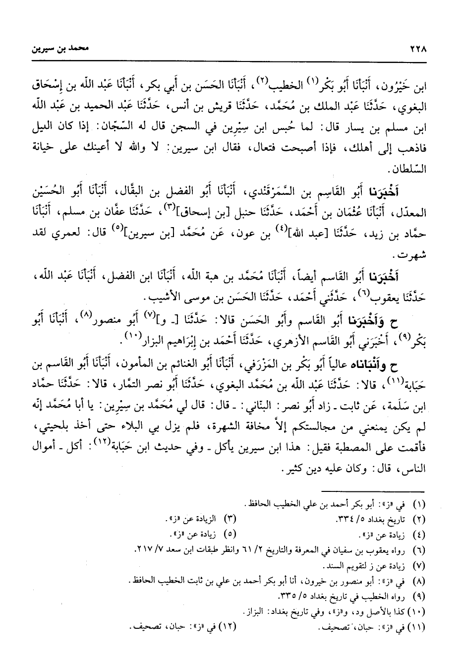 ابن خيرون أنبأنا أبو بكر (1) الخطيب (2) أنبأنا الحسن بن أبي بكر أنبأنا عبد الله بن إسحاق البغوي حدثنا عبد الملك بن محمد حدثنا قريش بن أنس حدثنا عبد الحميد بن عبد الله ابن مسلم بن يسار قال لما حبس ابن سيرين في السجن قال له السجان إذا كان الليل فاذهب إلى أهلك فإذا أصبحت فتعال فقال ابن سيرين لا والله لا أعينك على خيانة السلطان أخبرنا أبو القاسم بن السمرقندي أنبأنا أبو الفضل بن البقال أنبأنا أبو الحسين المعدل أنبأنا عثمان بن أحمد حدثنا حنبل بن إسحاق (3) حدثنا عفان بن مسلم أنبأنا حماد بن زيد حدثنا عبد الله (4) بن عون عن محمد بن سيرين (5) قال لعمري لقد شهرت أخبرنا أبو القاسم أيضا أنبأنا محمد بن هبة الله أنبأنا ابن الفضل أنبأنا عبد الله حدثنا يعقوب (6) حدثني أحمد حدثنا الحسن بن موسى الأشيب ح وأخبرنا أبو القاسم وأبو الحسن قالا حدثنا و (7) أبو منصور (8) أنبأنا أبو بكر (9) أخبرني أبو القاسم الأزهري حدثنا أحمد بن إبراهيم البزاز (10) ح وأنبأناه عاليا أبو بكر بن المزرفي أنبأنا أبو الغنائم بن المأمون أنبأنا أبو القاسم بن حبابة (11) قالا حدثنا عبد الله بن محمد البغوي حدثنا أبو نصر التمار قالا حدثنا حماد ابن سلمة عن ثابت زاد أبو نصر البناني قال قال لي محمد بن سيرين يا أبا محمد إنه لم يكن يمنعني من مجالستكم إلا مخافة الشهرة فلم يزل بي البلاء حتى أخذ بلحيتي فأقمت على المصطبة فقيل هذا ابن سيرين يأكل وفي حديث ابن حبابة (12) أكل أموال الناس قال وكان عليه دين كثير