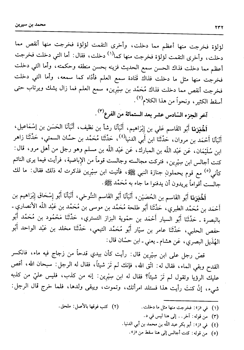 لؤلؤة فخرجت منها أعظم مما دخلت وأخرى التقمت لؤلؤة فخرجت منها أنقص مما دخلت وأخرى التقمت لؤلؤة فخرجت منها كما (1) دخلت فقال أما التي دخلت فخرجت أعظم مما دخلت فذاك الحسن سمع الحديث فزينه بحسن منطقه وحكمته وأما التي دخلت فخرجت منها مثل ما دخلت فذاك قتادة سمع العلم فأداه كما سمعه وأما التي دخلت أنقص مما دخلت فذاك محمد بن سيرين سمع العلم فما زال يشك ويرتاب حتى أسقط الكثير ونحوا من هذا الكلام (2) أخر الجزء السادس عشر بعد الستمائة من الفرع (3) أخبرنا أبو القاسم علي بن إبراهيم أنبأنا رشأ بن نظيف أنبأنا الحسن بن إسماعيل أنبأنا أحمد بن مروان حدثنا ابن أبي الدنيا (4) حدثنا محمد بن حسان السمتي حدثنا زاهر ابن سليمان عن عبد الله بن المبارك عن عبد الله بن مسلم وهو رجل من أهل مرو قال كنت أجالس ابن سيرين فتركت مجالسته وجالست قوما من الإباضية فرأيت فيما يرى النائم كأني (5) مع قوم يحملون جنازة النبي (صلى الله عليه وسلم) فأتيت ابن سيرين فذكرت له ذلك فقال ما لك جالست أقواما يريدون أن يدفنوا ما جاء به محمد (صلى الله عليه وسلم) أخبرنا أبو القاسم بن الحصين أنبأنا أبو القاسم التنوخي أنبأنا أبو إسحاق إبراهيم بن أحمد بن محمد الطبري حدثنا أبو طلحة محمد بن موسى بن محمد بن عبد الله الأنصاري بالبصرة حدثنا أبو السيار أحمد بن حموية البزاز التستري حدثنا محمود بن محمد أبو حفص الحلبي حدثنا عامر بن سيار أبو محمد التيمي حدثنا مخلد بن عبد الواحد أبو الهذيل البصري عن هشام يعني ابن حسان قال قص رجل على ابن سيرين قال رأيت كأن بيدي قدحا من زجاج فيه ماء فانكسر القدح وبقي الماء فقال له اتق الله فإنك لم تر شيئا فقال له الرجل سبحان الله أقص عليك الرؤيا وتقول لم تر شيئا فقال له ابن سيرين إنه من كذب فليس علي من كذبه شئ إن كنت رأيت هذا فستلد امرأتك وتموت ويبقى ولدها فلما خرج قال الرجل