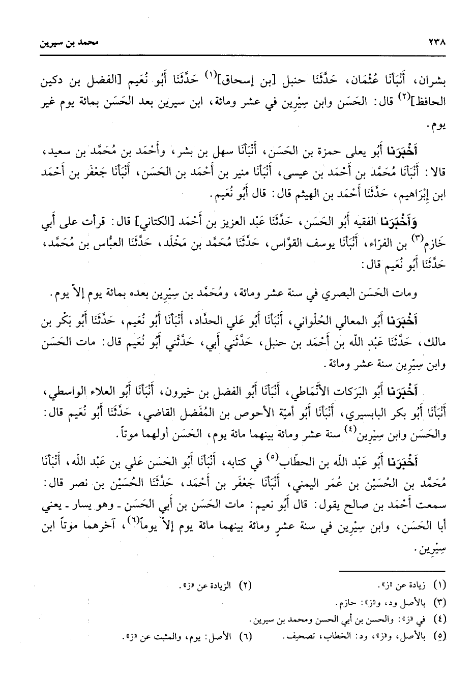 بشران أنبأنا عثمان حدثنا حنبل بن إسحاق (1) حدثنا أبو نعيم الفضل بن دكين الحافظ (2) قال الحسن وابن سيرين في عشر ومائة ابن سيرين بعد الحسن بمائة يوم غير يوم أخبرنا أبو يعلى حمزة بن الحسن أنبأنا سهل بن بشر وأحمد بن محمد بن سعيد قالا أنبأنا محمد بن أحمد بن عيسى أنبأنا منير بن أحمد بن الحسن أنبأنا جعفر بن أحمد ابن إبراهيم حدثنا أحمد بن الهيثم قال قال أبو نعيم وأخبرنا الفقيه أبو الحسن حدثنا عبد العزيز بن أحمد الكتاني قال قرأت على أبي خازم (3) بن الفراء أنبأنا يوسف القواس حدثنا محمد بن مخلد حدثنا العباس بن محمد حدثنا أبو نعيم قال ومات الحسن البصري في سنة عشر ومائة ومحمد بن سيرين بعده بمائة يوم إلا يوم أخبرنا أبو المعالي الحلواني أنبأنا أبو علي الحداد أنبأنا أبو نعيم حدثنا أبو بكر بن مالك حدثنا عبد الله بن أحمد بن حنبل حدثني أبي حدثني أبو نعيم قال مات الحسن وابن سيرين سنة عشر ومائة أخبرنا أبو البركات الأنماطي أنبأنا أبو الفضل بن خيرون أنبأنا أبو العلاء الواسطي أنبأنا أبو بكر البابسيري أنبأنا أبو أمية الأحوص بن المفضل القاضي حدثنا أبو نعيم قال حسن والحسن وابن سيرين (4) سنة عشر ومائة بينهما مائة يوم الحسن أولهما موتا أخبرنا أبو عبد الله بن الحطاب (5) في كتابه أنبأنا أبو الحسن علي بن عبد الله أنبأنا محمد بن الحسين بن عمر اليمني أنبأنا جعفر بن أحمد حدثنا الحسين بن نصر قال سمعت أحمد بن صالح يقول قال أبو نعيم مات الحسن بن أبي الحسن وهو يسار يعني أبا الحسن وابن سيرين في سنة عشر ومائة بينهما مائة يوم إلا يوما (6) آخرهما موتا ابن سيرين