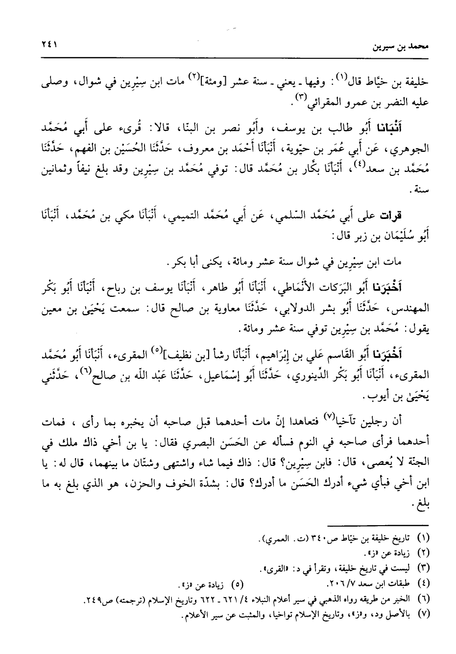 خليفة بن خياط قال (1) وفيها يعني سنة عشر ومئة (2) مات ابن سيرين في شوال وصلى عليه النضر بن عمرو المقرائي (3) أنبأنا أبو طالب بن يوسف وأبو نصر بن البنا قالا قرئ على أبي محمد الجوهري عن أبي عمر بن حيوية أنبأنا أحمد بن معروف حدثنا الحسين بن الفهم حدثنا محمد بن سعد (4) أنبأنا بكار بن محمد قال توفي محمد بن سيرين وقد بلغ نيفا وثمانين سنة قرأت على أبي محمد السلمي عن أبي محمد التميمي أنبأنا مكي بن محمد أنبأنا أبو سليمان بن زبر قال مات ابن سيرين في شوال سنة عشر ومائة يكنى أبا بكر أخبرنا أبو البركات الأنماطي أنبأنا أبو طاهر أنبأنا يوسف بن رباح أنبأنا أبو بكر المهندس حدثنا أبو بشر الدولابي حدثنا معاوية بن صالح قال سمعت يحيى بن معين يقول محمد بن سيرين توفي سنة عشر ومائة أخبرنا أبو القاسم علي بن إبراهيم أنبأنا رشأ بن نظيف (5) المقرئ أنبأنا أبو محمد المقرئ أنبأنا أبو بكر الدينوري حدثنا أبو إسماعيل حدثنا عبد الله بن صالح (6) حدثني يحيى بن أيوب أن رجلين تآخيا (7) فتعاهدا إن مات أحدهما قبل صاحبه أن يخبره بما رأى فمات أحدهما فرأى صاحبه في النوم فسأله عن الحسن البصري فقال يا بن أخي ذاك ملك في الجنة لا يعصى قال فابن سيرين قال ذاك فيما شاء واشتهى وشتان ما بينهما قال له يا ابن أخي فبأي شئ أدرك الحسن ما أدرك قال بشدة الخوف والحزن هو الذب بلغ به ما بلغ