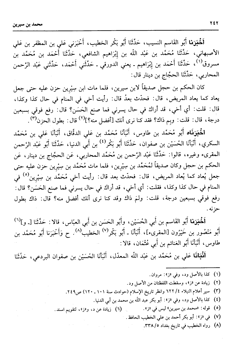 أخبرنا أبو القاسم النسيب حدثنا أبو بكر الخطيب أخبرني علي بن المظفر بن علي الأصبهاني حدثنا محمد بن عبد الله بن إبراهيم الشافعي حدثنا أحمد بن محمد بن مسروق (1) حدثنا أحمد بن إبراهيم يعني الدورقي حدثني أحمد حدثني عبد الرحمن المحاربي حدثنا الحجاج بن دينار قال كان الحكم بن حجل صديقا لابن سيرين فلما مات ابن سيرين حزن عليه حتى جعل يعاد كما يعاد المريض قال فحدث بعد قال رأيت أخي في المنام في حال كذا وكذا قال قلت أي أخي قد أراك في حال يسرني فما صنع الحسن قال رفع فوقي بسبعين درجة قال قلت وبم ذاك فقد كنا نرى أنك أفضل منه (2) قال بطول الحزن (3) أخبرناه أبو محمد بن طاوس أنبأنا محمد بن علي الدقاق أنبأنا علي بن محمد السكري أنبأنا الحسين بن صفوان حدثنا أبو بكر (4) بن أبي الدنيا حدثنا أبو عبد الرحمن المقرئ وغيره قالوا حدثنا عبد الرحمن بن محمد المحاربي عن الحجاج بن دينا عن الحكم بن حجل وكان صديقا لمحمد بن سيرين فلما مات محمد بن سيرين حزن عليه حتى جعل يعاد كما يعاد المريض قال فحدث بعد قال رأيت أخي محمد بن سيرين (5) في المنام في حال كذا وكذا فقلت أي أخي قد أراك في حال يسرني فما صنع الحسن قال رفع فوقي بسبعين درجة قلت ولم ذاك وقد كنا نرى أنك أفضل منه قال ذاك بطول حزنه أخبرنا أبو القاسم بن أبي الحسين وأبو الحسن بن أبي العباس قالا حدثنا وأبو منصور بن خيرون المقرئ أنبأنا أبو بكر (7) الخطيب (8) وأخبرنا أبو محمد بن طاوس أنبأنا أبو الغنائم بن أبي عثمان قالا أنبأنا علي بن محمد بن عبد الله المعدل أنبأنا الحسين بن صفوان البردعي حدثنا