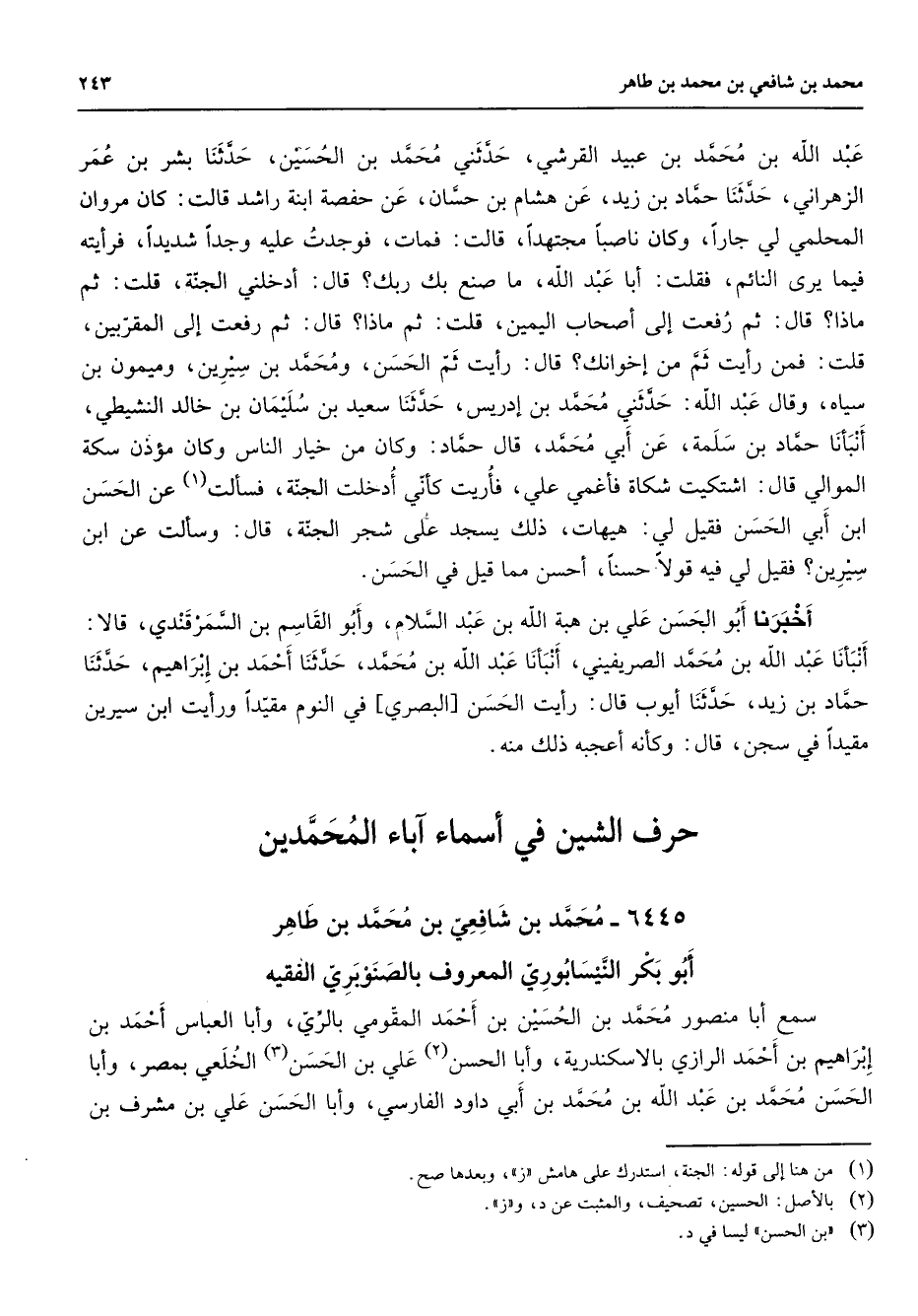 عبد الله بن محمد بن عبيد القرشي حدثني محمد بن الحسين حدثنا بشر بن عمر الزهراني حدثنا حماد بن زيد عن هشام بن حسان عن حفصة ابنة راشد قالت كان مروان المحلمي لي جارا وكان ناصبا مجتهدا قالت فمات فوجدت عليه وجدا شديدا فرأيته فيما يرى النائم فقلت أبا عبد الله ما صنع بك ربك قال أدخلني الجنة قلت ثم ماذا قال ثم رفعت إلى أصحاب اليمين قلت ثم ماذا قال ثم رفعت إلى المقربين قلت قلت فمن رأيت ثم من إخوانك قال رأيت ثم الحسن ومحمد بن سيرين وميمون بن سياه وقال عبد الله حدثني محمد بن إدريس حدثنا سعيد بن سليمان بن خالد النشيطي أنبأنا حماد بن سلمة عن أبي محمد قال حماد وكان من خيار الناس وكان مؤذن سكة الموالي قال اشتكيت شكاة فأغمي علي فأريت كأني أدخلت الجنة فسألت (1) عن الحسن ابن أبي الحسن فقيل لي هيهات ذلك يسجد على شجر الجنة قال وسألت عن ابن سيرين فقيل لي فيه قولا حسنا أحسن مما قيل في الحسن أخبرنا أبو الحسن علي بن هبة الله بن عبد السلام وأبو القاسم بن السمرقندي قالا أنبأنا عبد الله بن محمد الصريفيني أنبأنا عبد الله بن محمد حدثنا أحمد بن إبراهيم حدثنا حماد بن زيد حدثنا أيوب قال رأيت الحسن البصري في النوم مقيدا ورأيت ابن سيرين مقيدا في سجن قال وكأنه أعجبه ذلك منه " حرف الشين في أسماء آباء المحمدين "