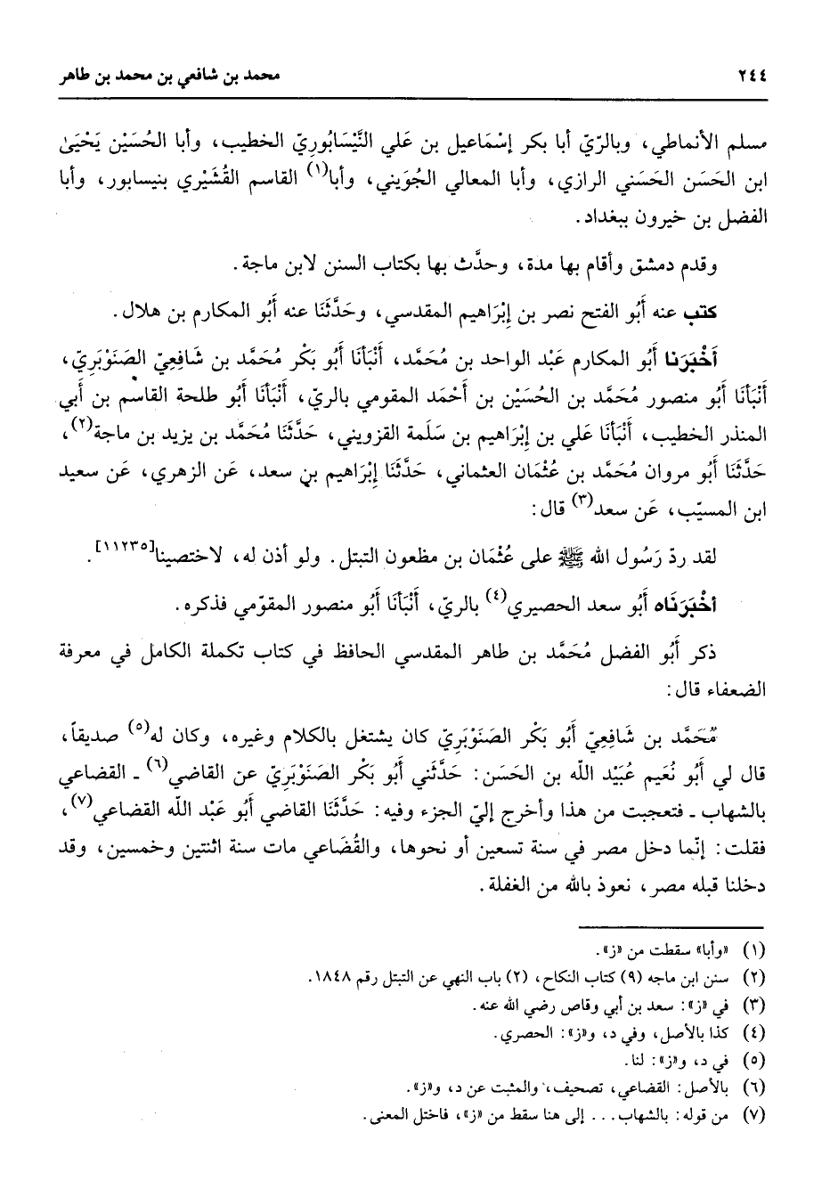 مسلم الأنماطي وبالري أبا بكر إسماعيل بن علي النيسابوري الخطيب وأبا الحسين يحيى ابن الحسن الحسني الرازي وأبا المعالي الجويني وأبا (1) القاسم القشيري بنيسابور وأبا الفضل بن خيرون ببغداد وقدم دمشق وأقام بها مدة وحدث بها بكتاب السنن لابن ماجة كتب عنه أبو الفتح نصر بن إبراهيم المقدسي وحدثنا عنه أبو المكارم بن هلال أخبرنا أبو المكارم عبد الواحد بن محمد أنبأنا أبو بكر محمد بن شافعي الصنوبري أنبأنا أبو منصور محمد بن الحسين بن أحمد المقومي بالري أنبأنا أبو طلحة القاسم بن أبي المنذر الخطيب أنبأنا علي بن إبراهيم بن سلمة القزويني حدثنا محمد بن يزيد بن ماجة (2) حدثنا أبو مروان محمد بن عثمان العثماني حدثنا إبراهيم بن سعد عن الزهري عن سعيد ابن المسيب عن سعد (3) قال لقد رد رسول الله (صلى الله عليه وسلم) على عثمان بن مظعون التبتل ولو أذن له لاختصينا